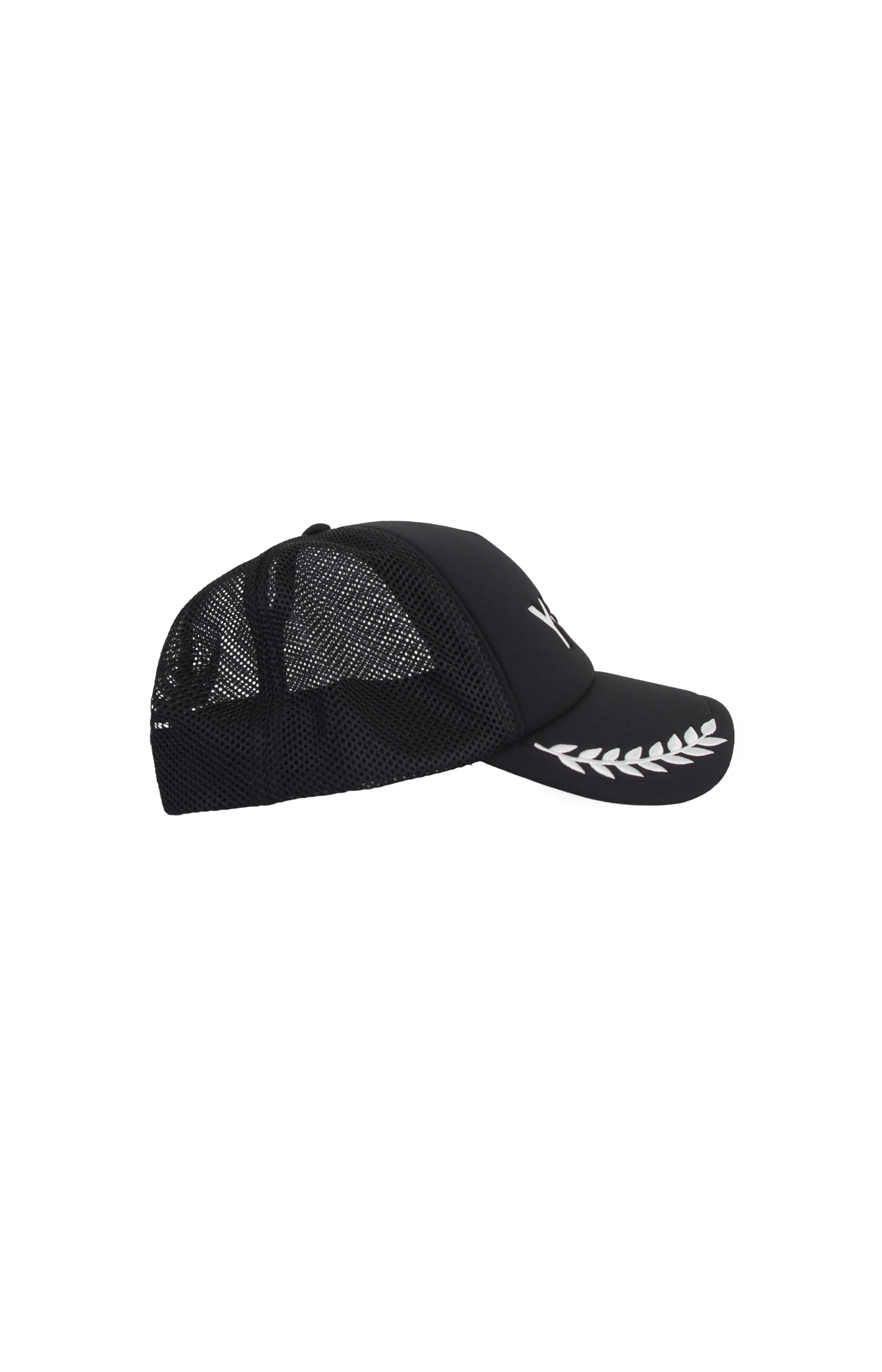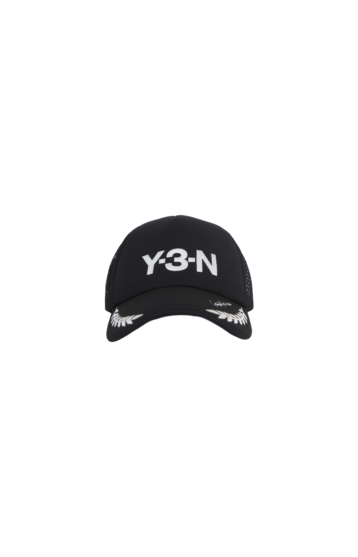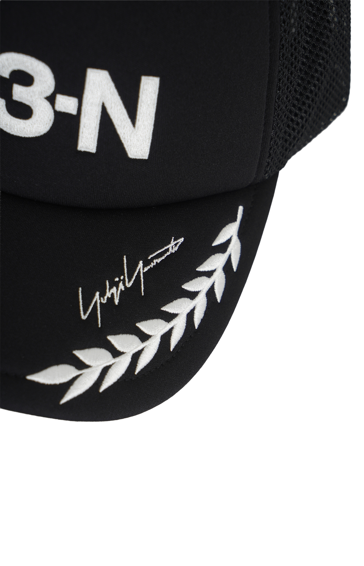 This trucker cap by Y-3 is crafted with a structured front panel and mesh back construction. It features a curved brim with graphic detailing, a Y-3-N print at the front, and an adjustable snapback closure.