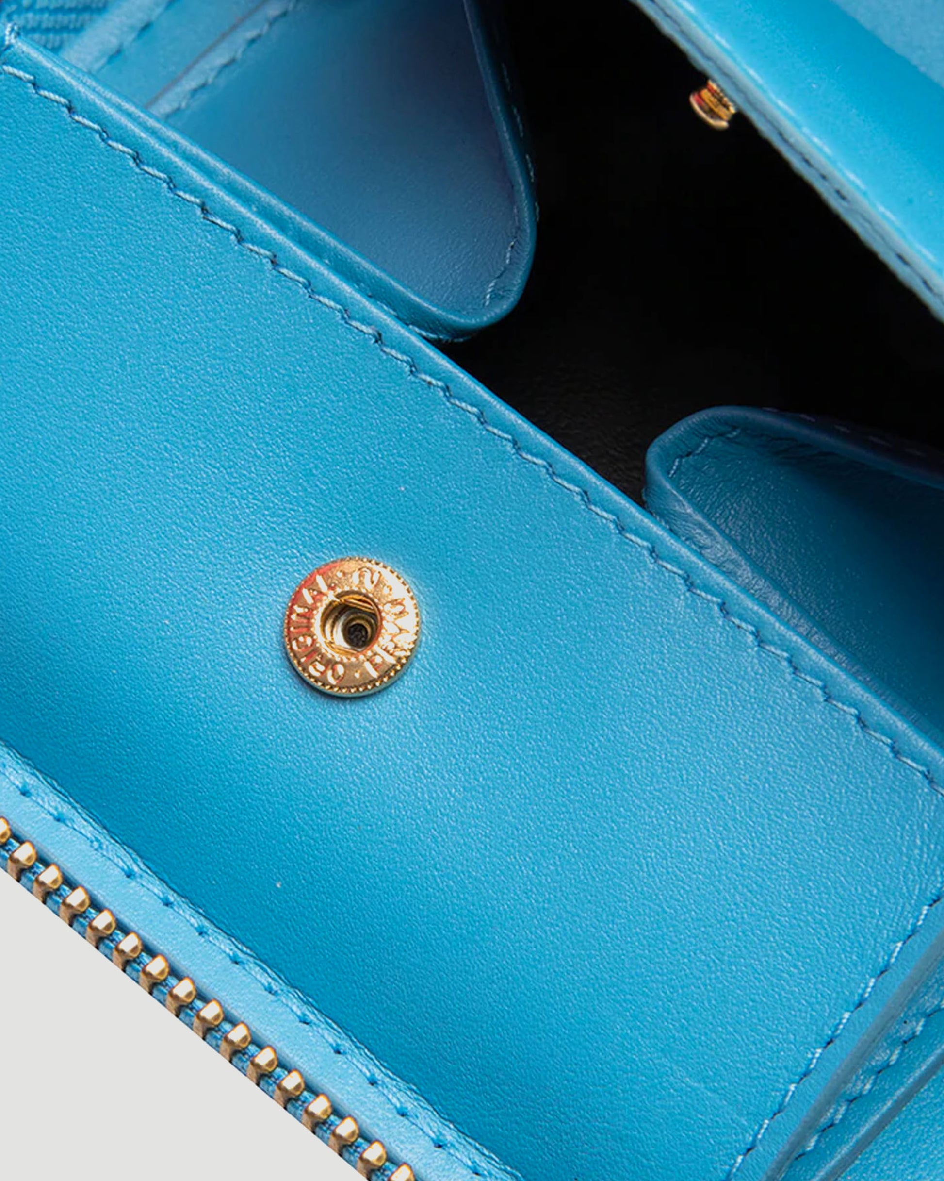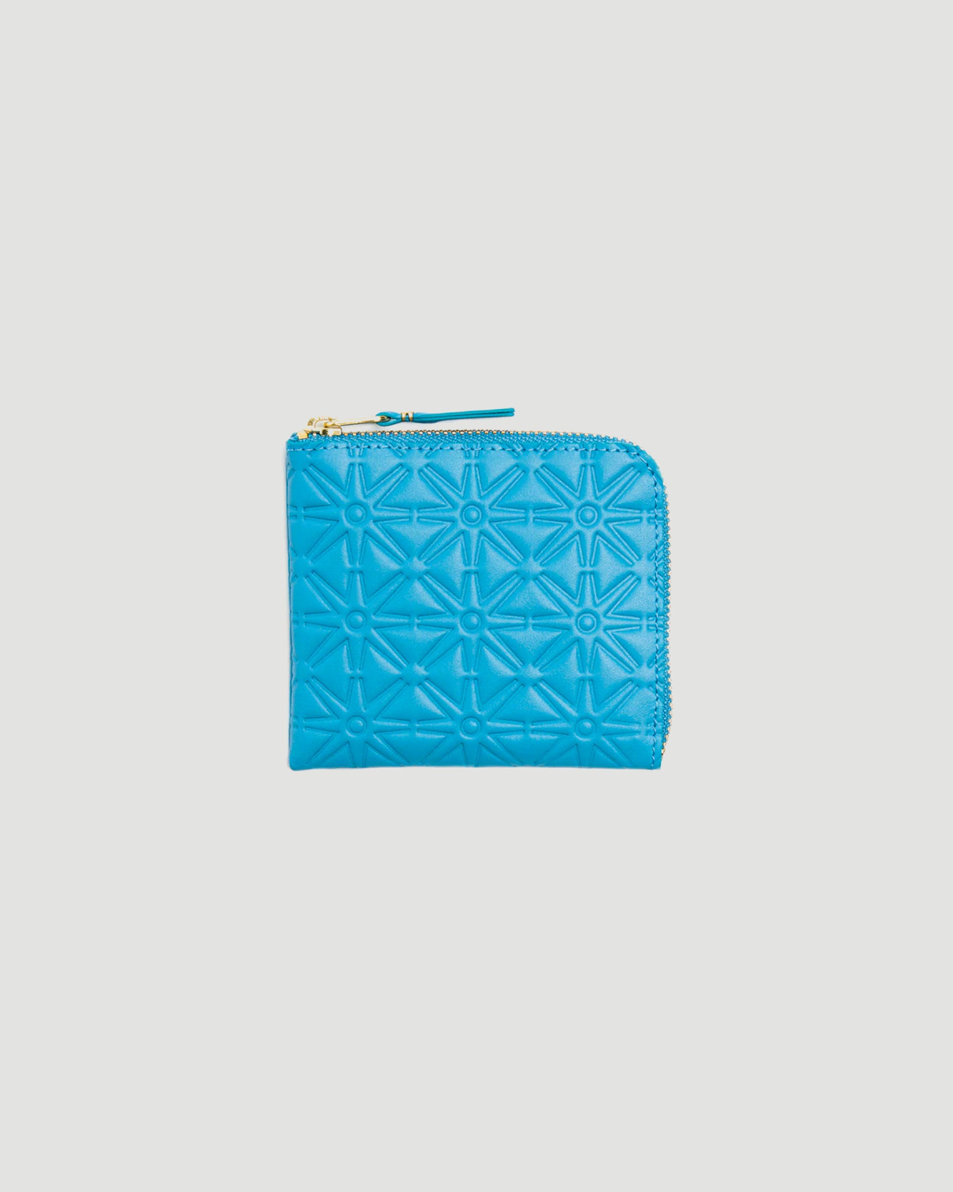 A stylish accessory that will carry the essentials - the Comme des Garçons Wallet blue embossed leather zipper wallet. Features a two-sided zipper compartment with an interior slip pocket.