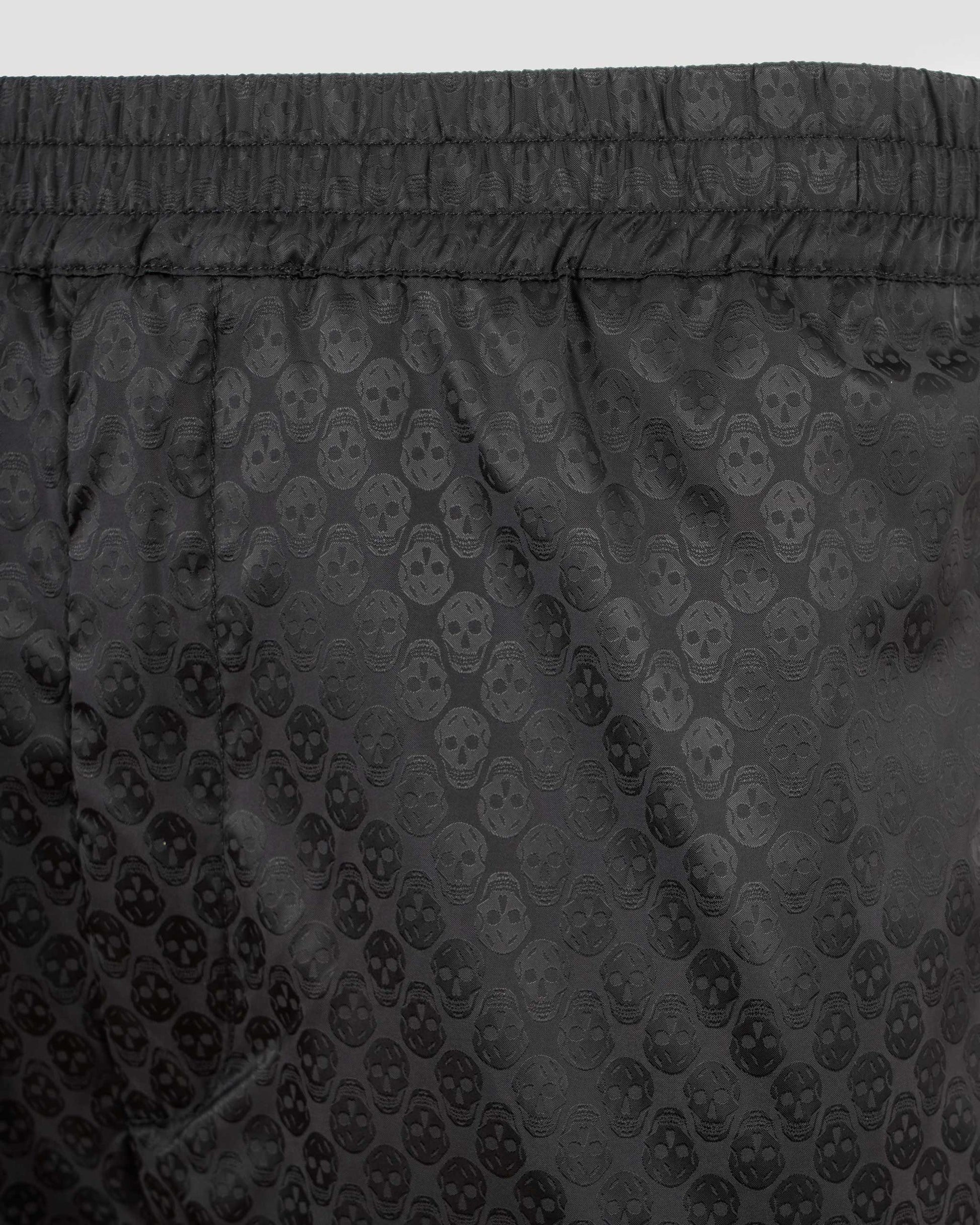 These joggers by Alexander McQueen are crafted from black light nylon with a skull jacquard pattern. They feature an elasticated waist, side zip pockets, and a back welt pocket.