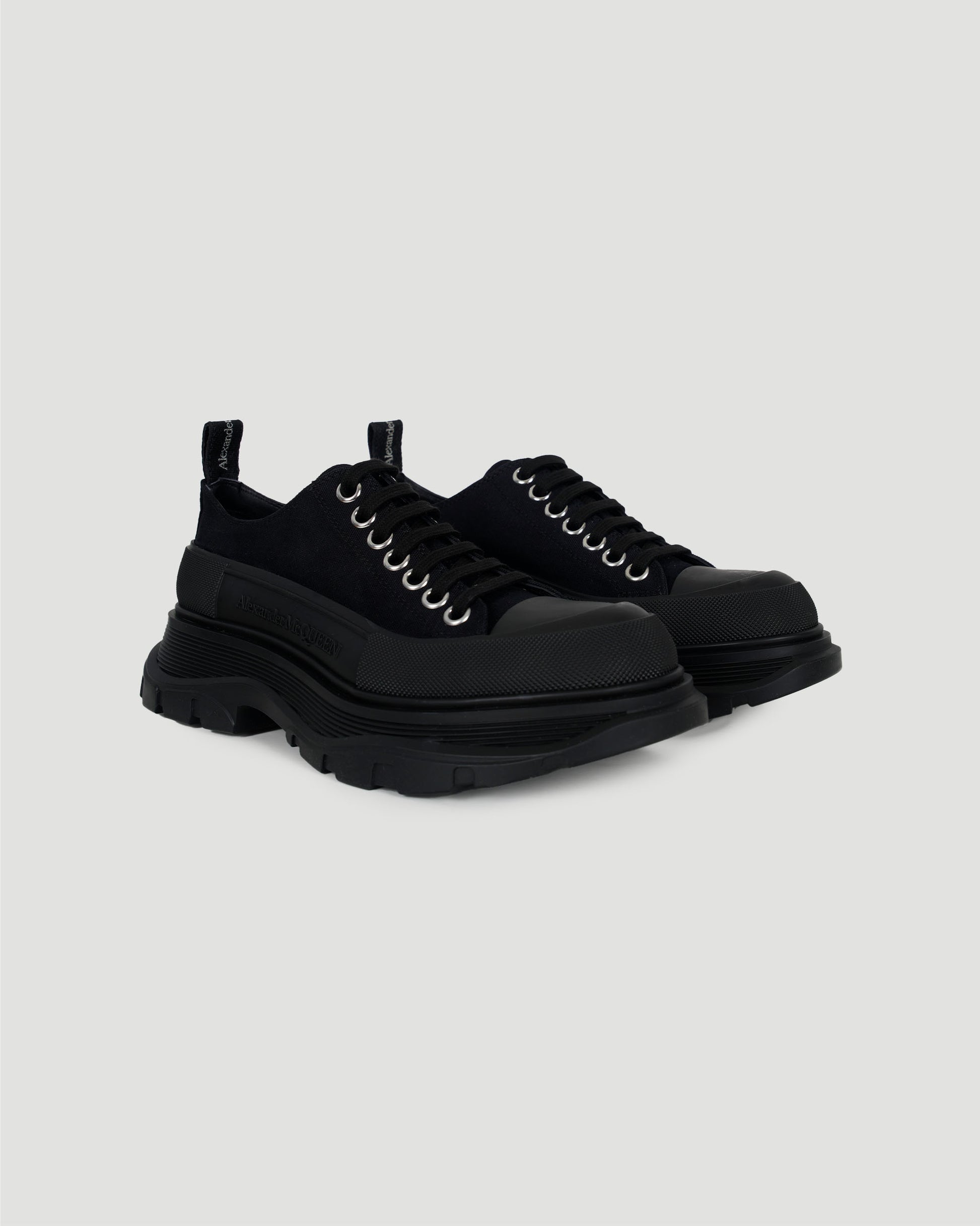 Crafted from black canvas, this Tread Slick lace-up from Alexander McQueen is detailed with a textured rubber wrap and tonal Alexander McQueen signature. The style is finished with a lightweight oversized rubber tread sole.