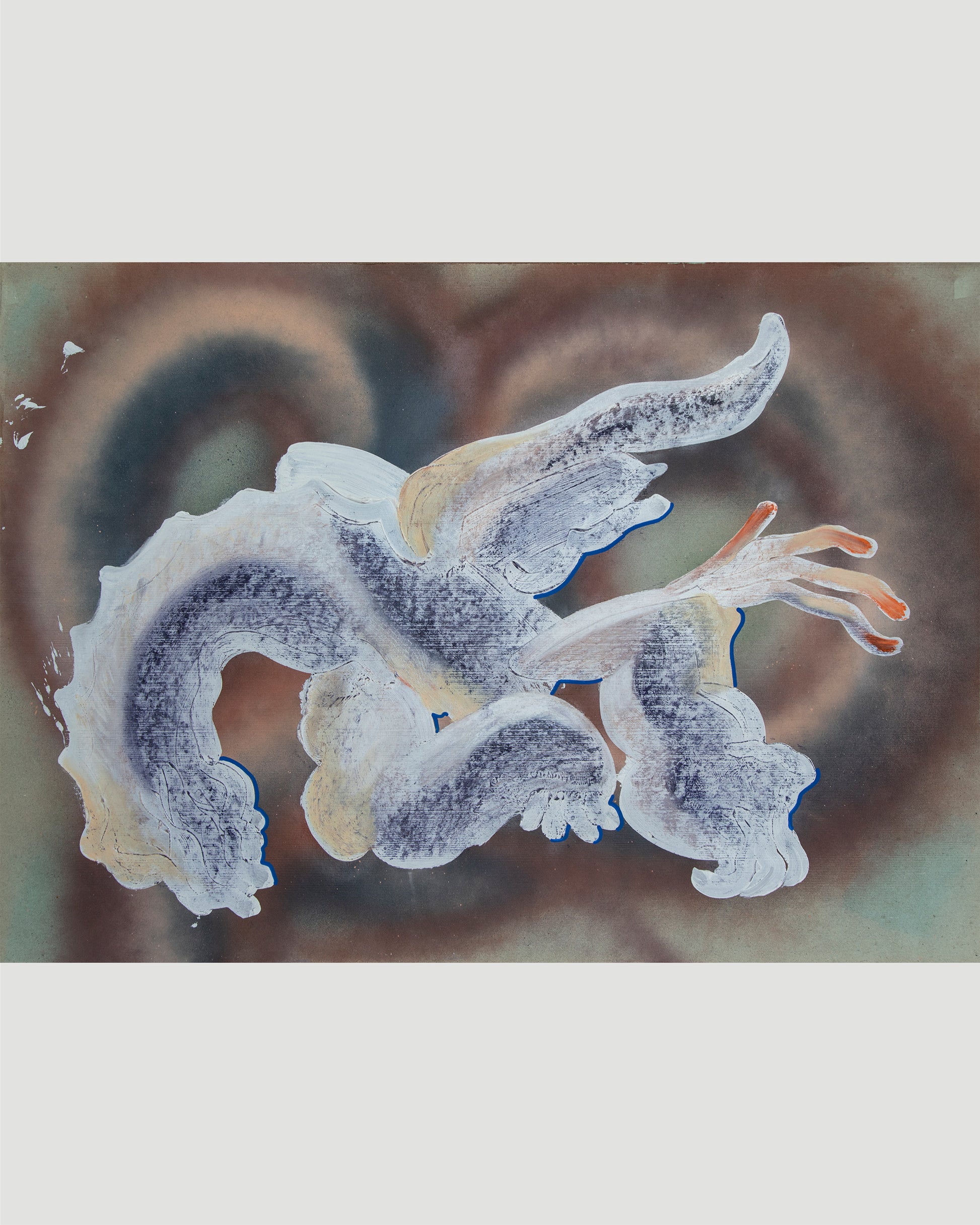 This abstract composition merges fluid organic forms with textured layers of white, gray, and