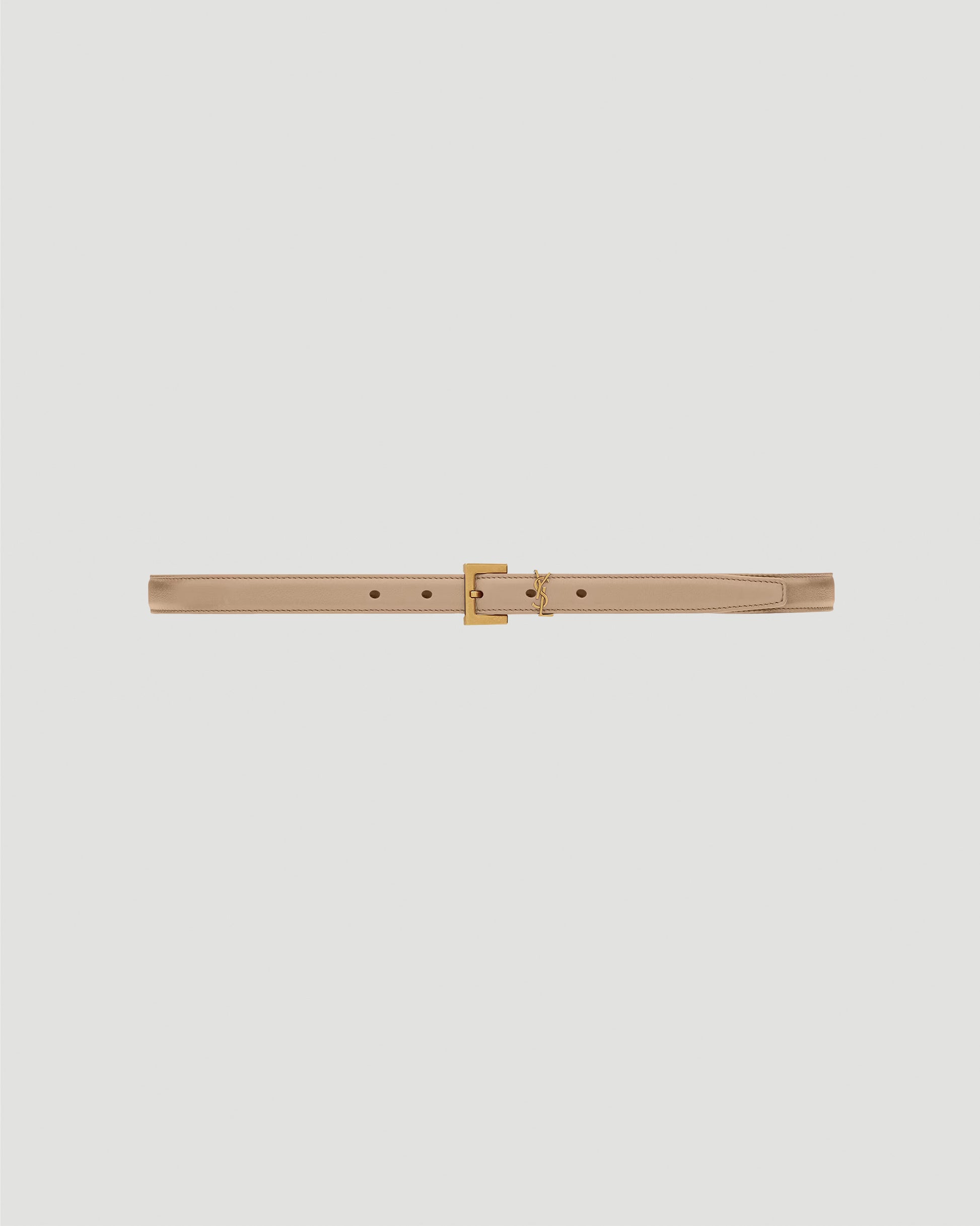 The Saint Laurent thin belt exudes understated elegance, featuring an adjustable square buckle and a signature Cassande loop for a refined finish. Crafted with bronze-tone hardware, it offers a sleek and versatile design, perfect for cinching the waist or adding a sophisticated touch to any outfit.
