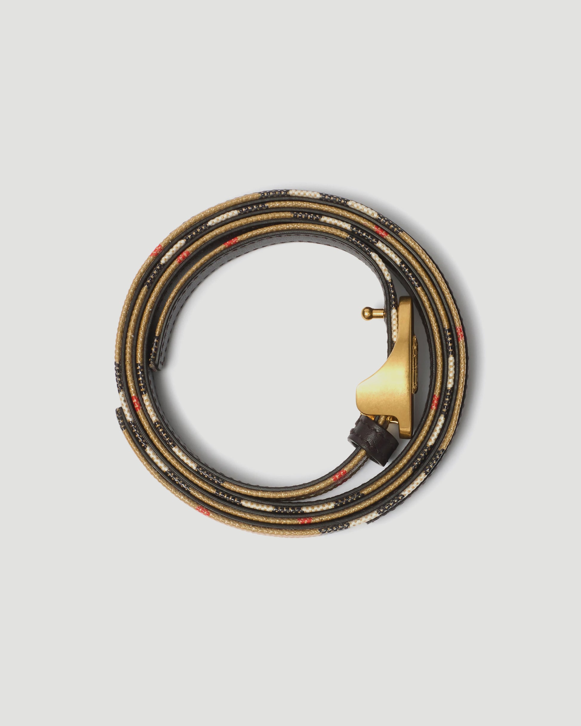 This Burberry belt is crafted from a coated cotton-linen blend, jacquard-woven with the iconic Burberry Check. The reversible design features a smooth grainy calf leather side, offering versatility in styling. Finished with a metal buckle engraved with the Burberry logo and Knight stamp.
