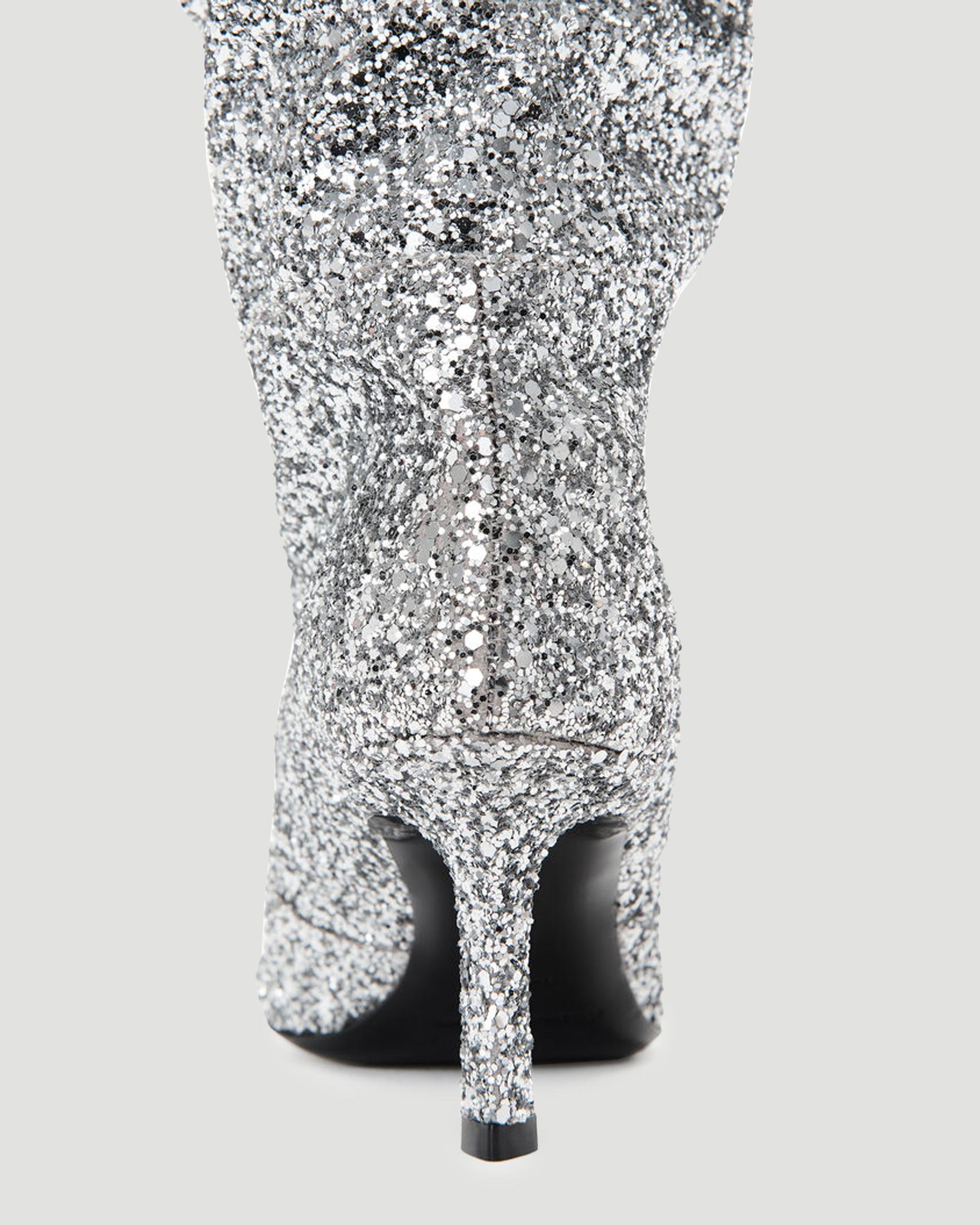 Stand out with your unique style thanks to Alexander Wang. Viola 65 slouch boots are crafted from capretto leather with a silver glitter effect. Featuring mid-stiletto heel, relaxed fit and scrunched shaft. Style them with a micro skirt and turtleneck for a outstanding look.