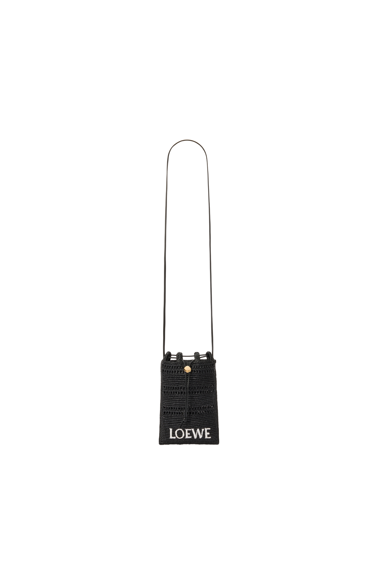 This drawstring pocket by Loewe is crafted from raffia with contrast LOEWE embroidery. It features a tubular leather strap adjustable with an Anagram Pebble press button and engraved Anagram detail. An unlined interior completes the design.