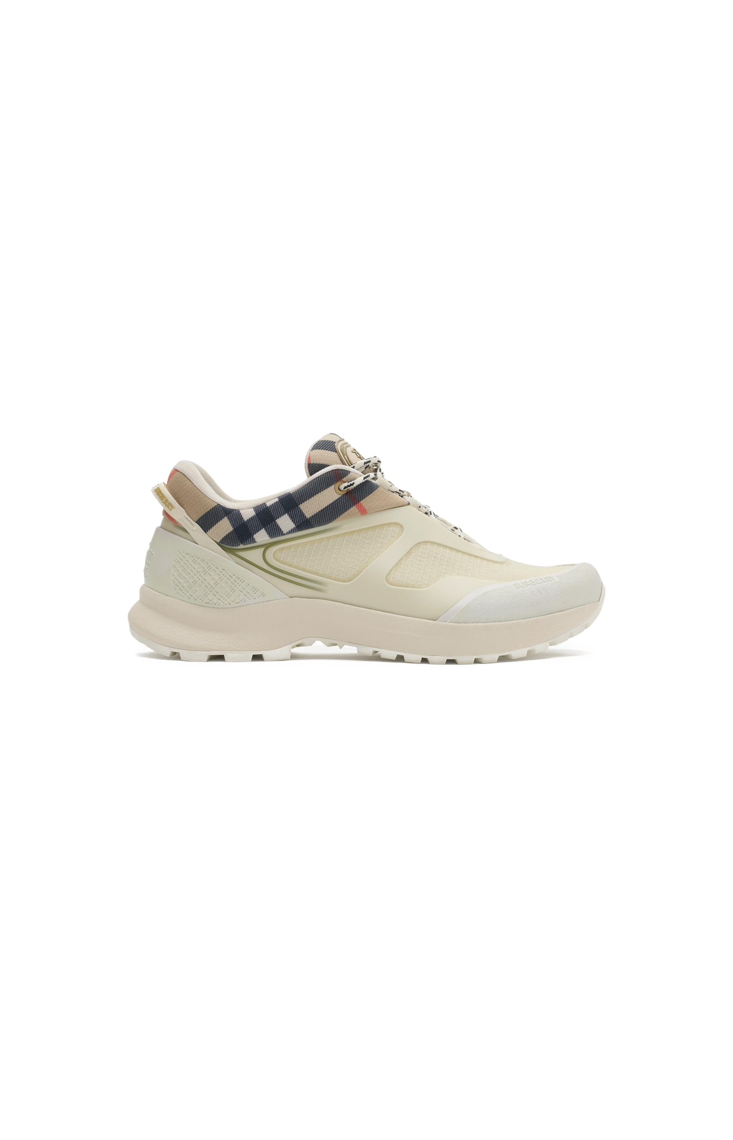This low-top sport shoe by Burberry is crafted from a mix of textile and leather-effect materials with a chunky rubber sole. It features a multicolour check panel, quilted detailing, and subtle logo accents on the side, heel, and interior.