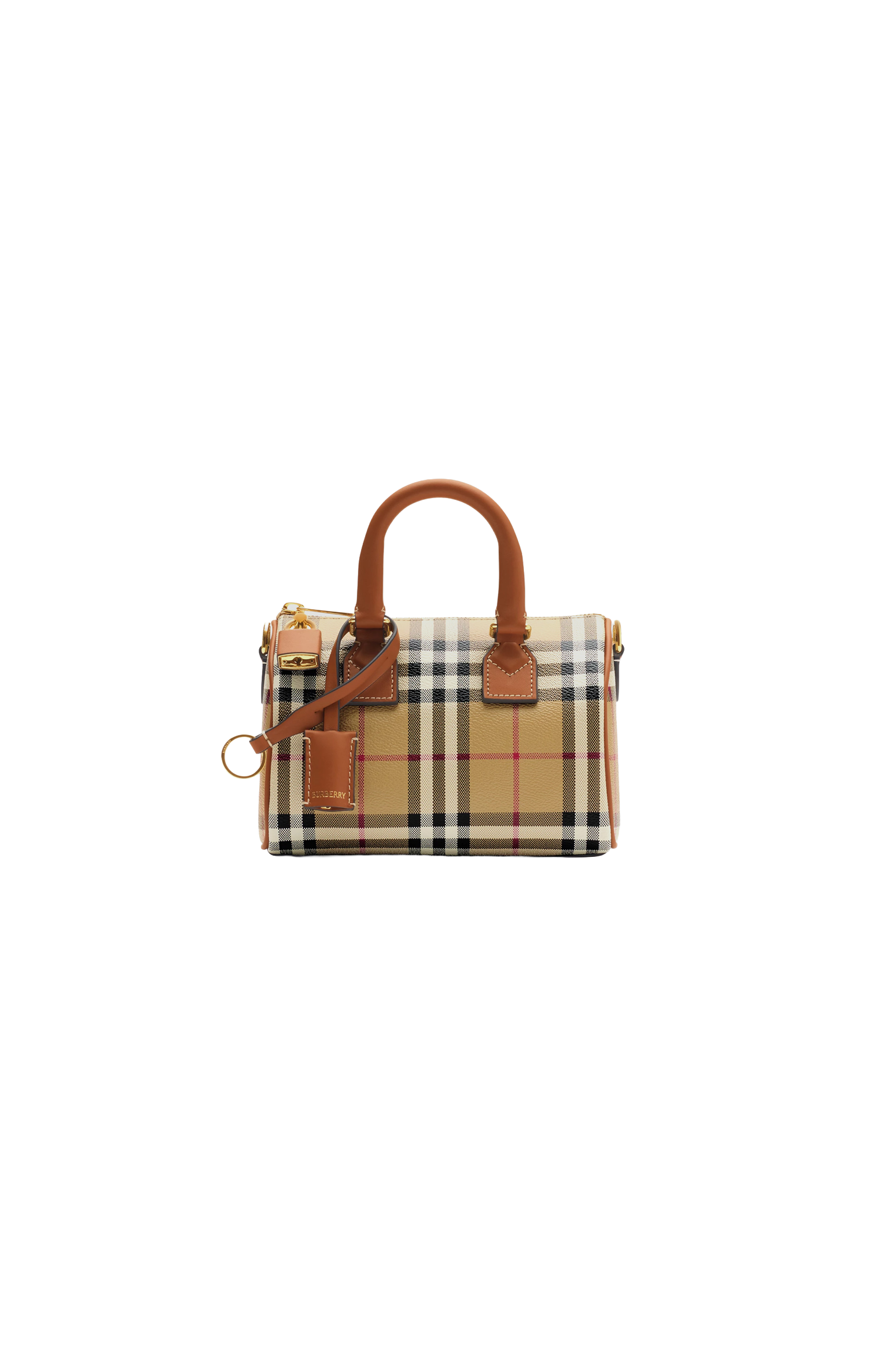 This compact bowling bag by Burberry is crafted in Italy from a coated cotton blend printed with the Burberry Check and trimmed with smooth calf leather. It features rolled leather top handles, a detachable adjustable strap, zip closure, cotton lining, polished metal hardware, and a leather-wrapped padlock and key.