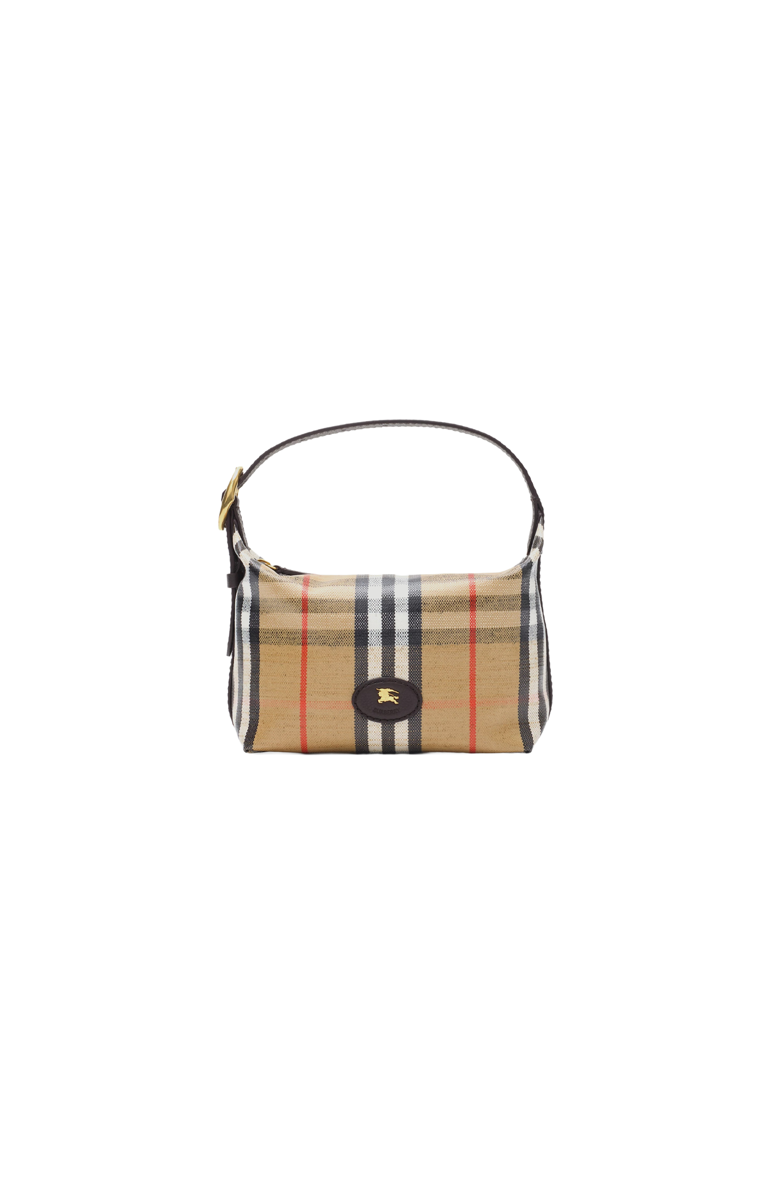 This mini duffle bag by Burberry is crafted in Italy from a coated cotton linen blend jacquard-woven with the Burberry Check and trimmed with smooth calf leather. It features an adjustable leather shoulder strap, zip closure, brushed metal hardware, and a leather patch with the Equestrian Knight Design at the front.