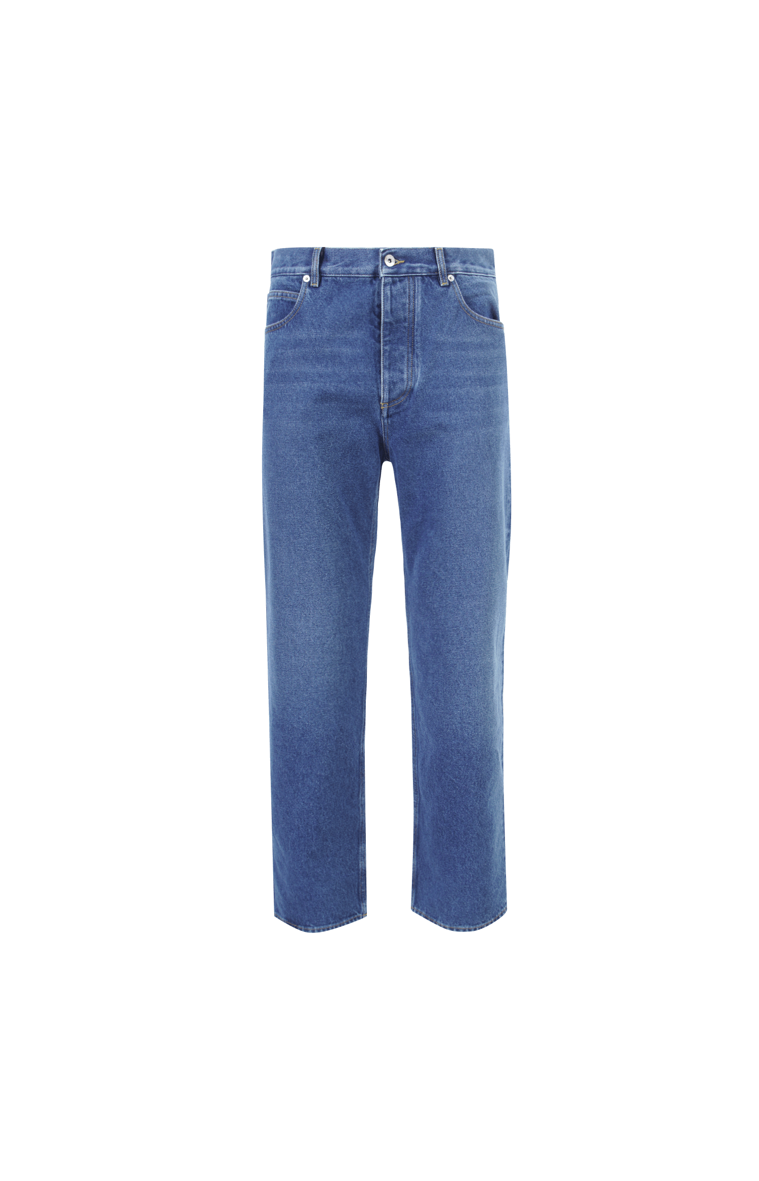 This jeans by Bottega Veneta are crafted in medium indigo washed denim with a straight-leg silhouette. They feature a button closure and an embossed Intrecciato leather patch. Made in Italy.