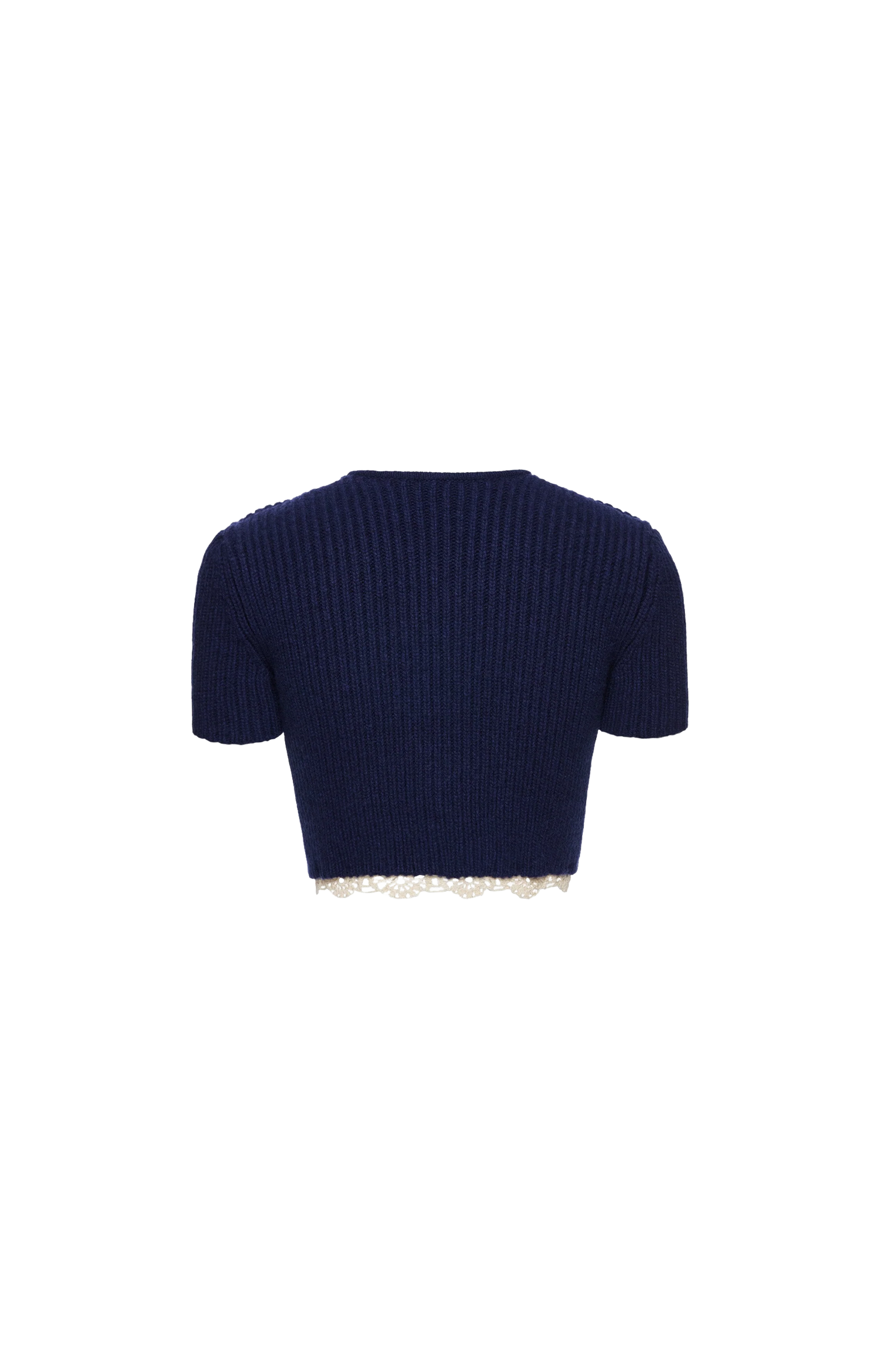 This cardigan by Magda Butrym is crafted in soft cashmere with a cropped silhouette. It features short sleeves, a front button closure, and crochet lace trim along the hem.