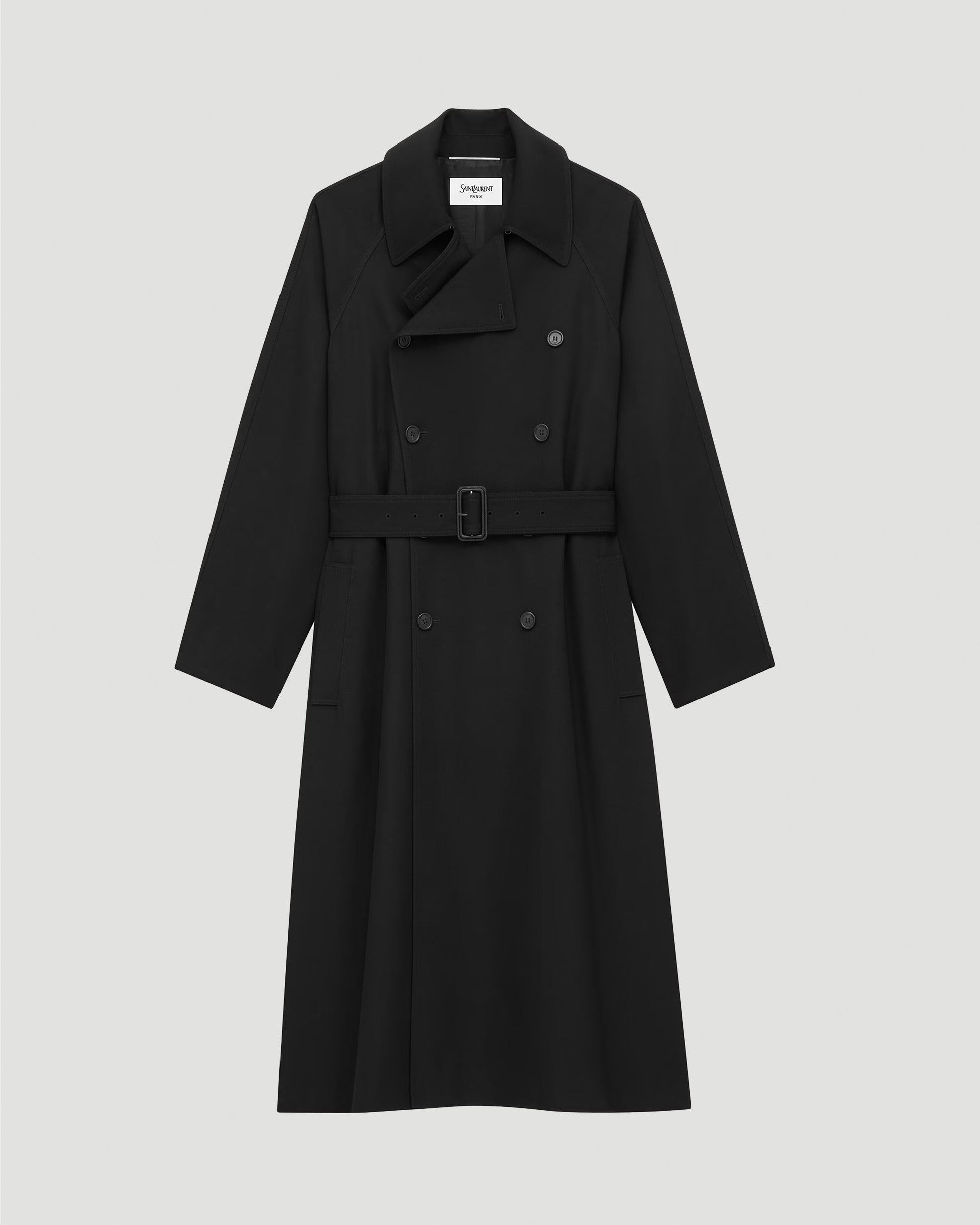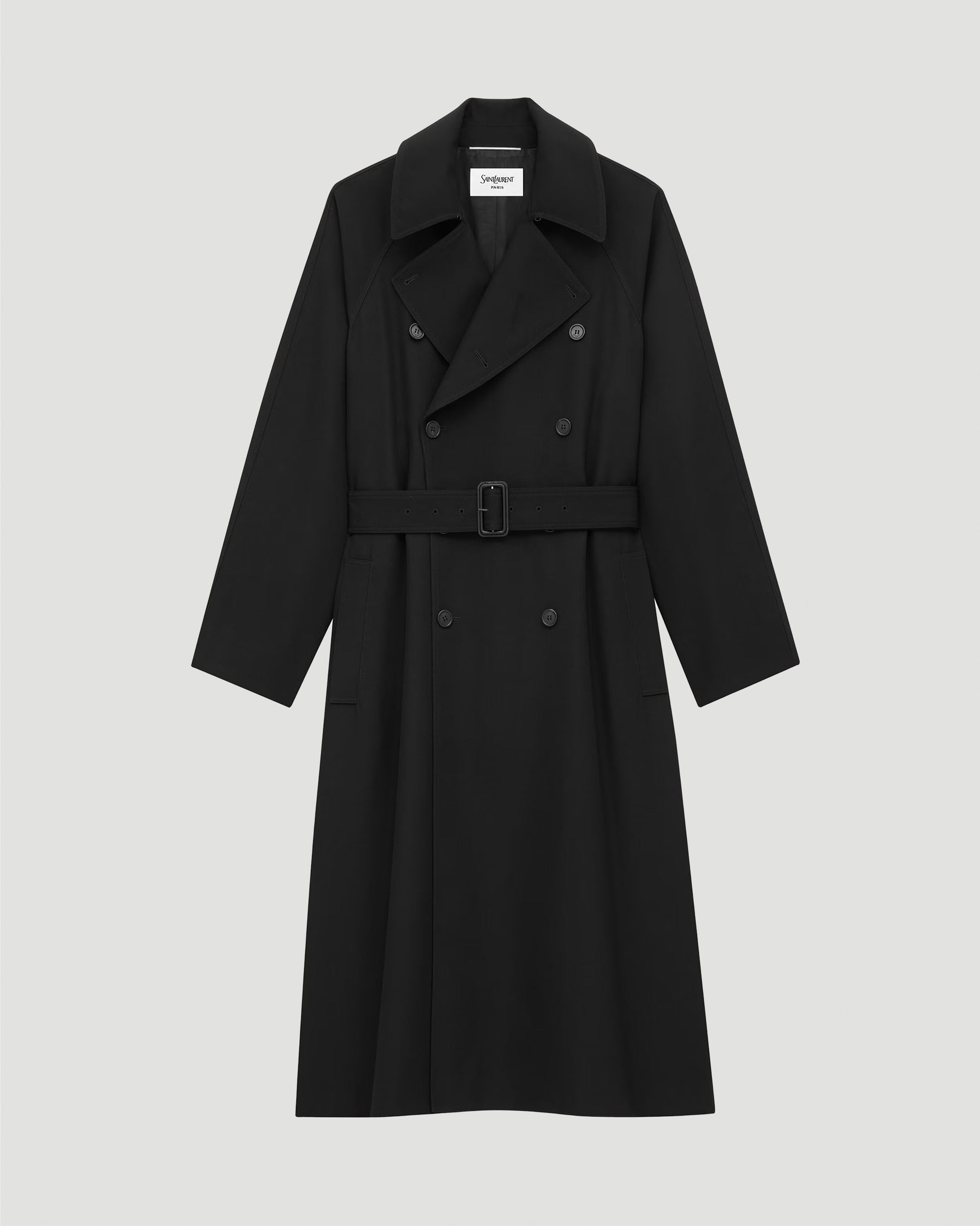 This Saint Laurent long double-breasted coat is crafted from certified wool with an eight-button front. It features a two-way ulster collar, raglan sleeves, two front welt pockets, and an adjustable, removable belt.