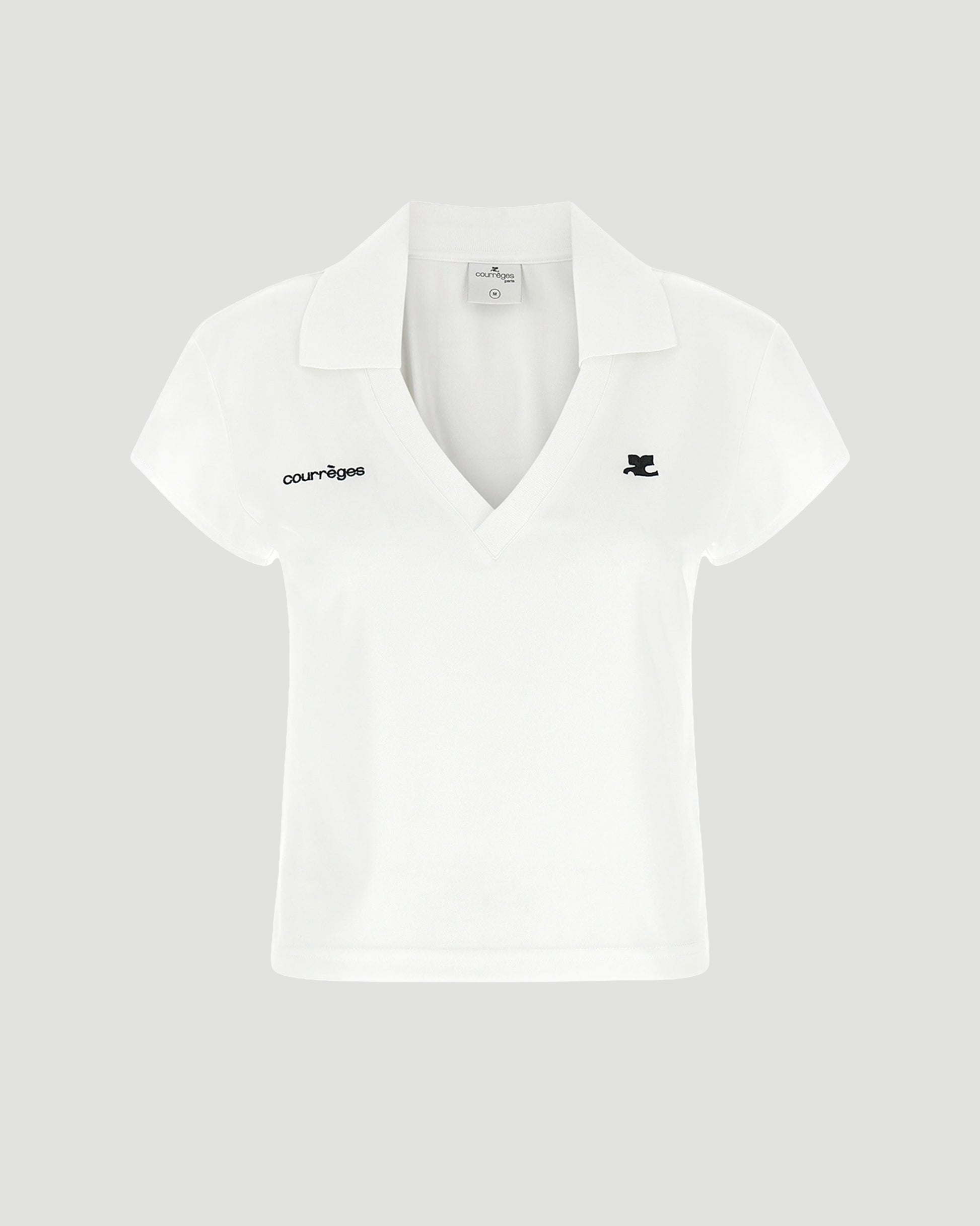 This jersey polo shirt by Courrèges features a V-neckline and short sleeves. Finished with an embroidered logo at the chest.