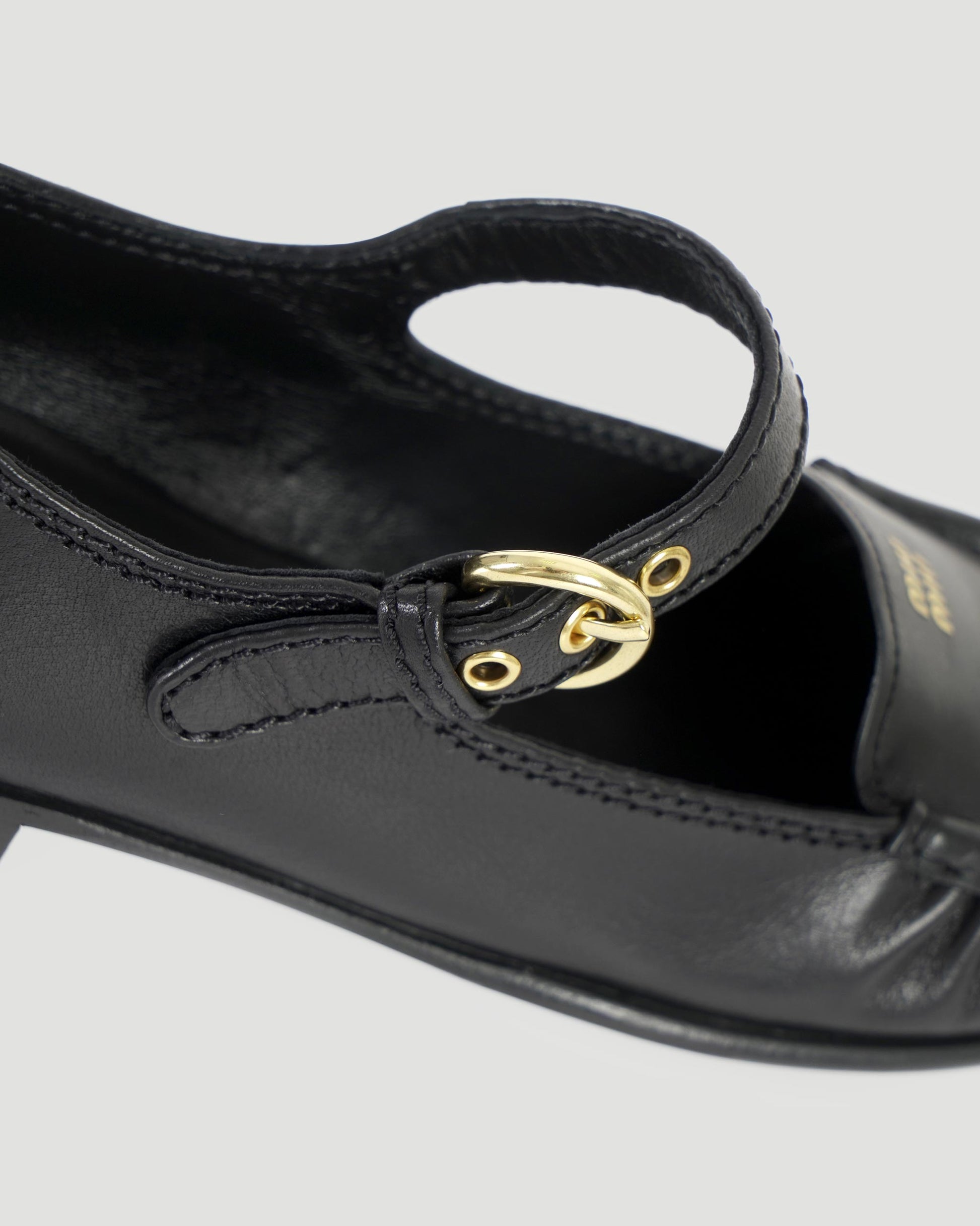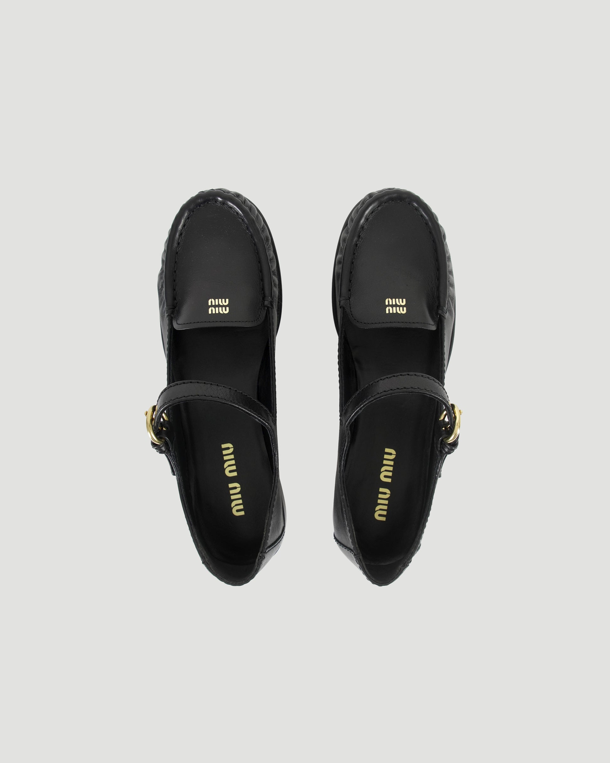 This Miu Miu loafer-Mary Jane hybrid is crafted from buffalo leather with an ultralight, ruched design. It features a strap with a gold-tone buckle, an embossed logo on the apron, and a leather lining. Heel height: 1.5 cm.