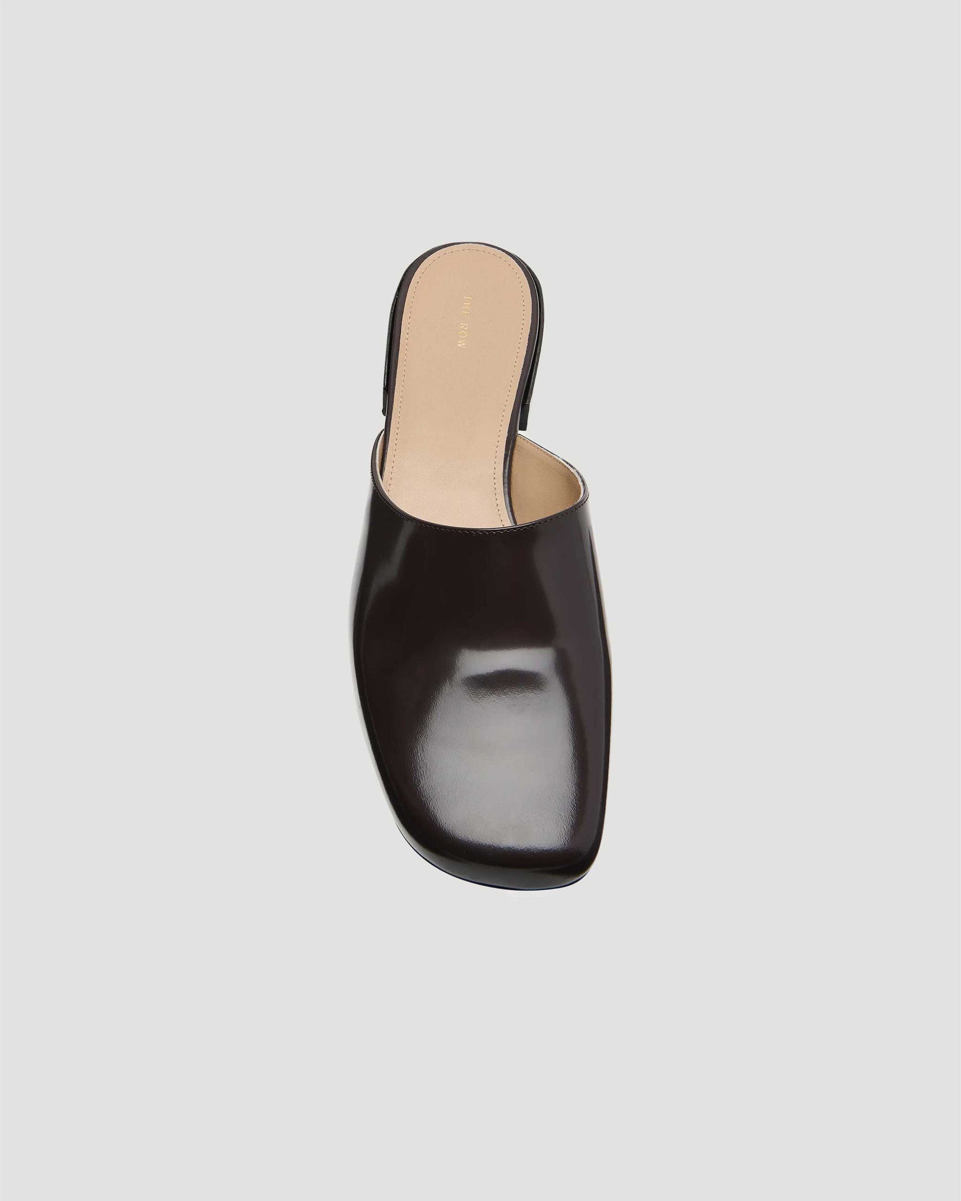 Streamlined slip-on shoes by The Row, crafted from glossy patent leather. Designed with a square toe, low stacked heel, and durable rubber sole, combining sleek minimalism with refined everyday wear.