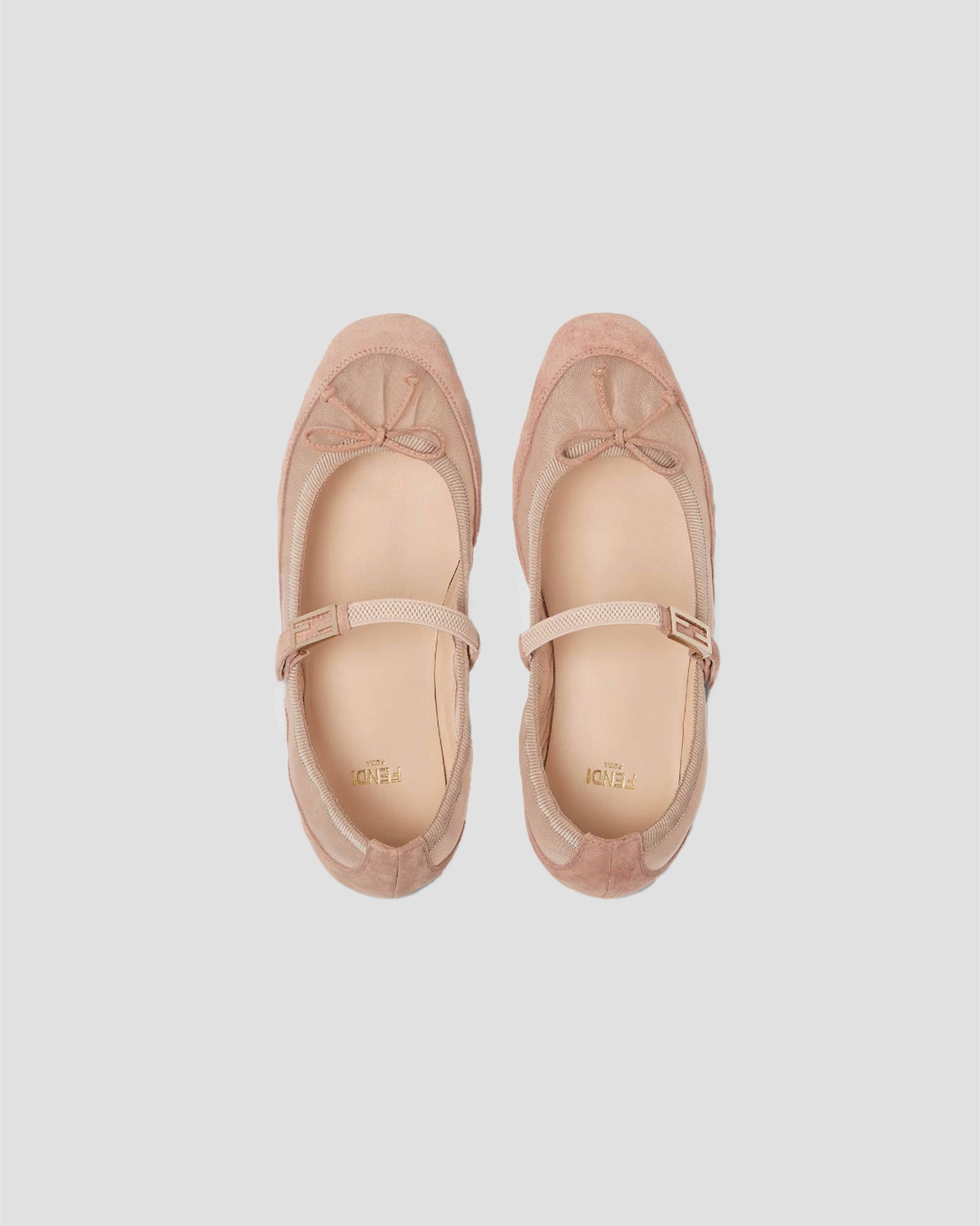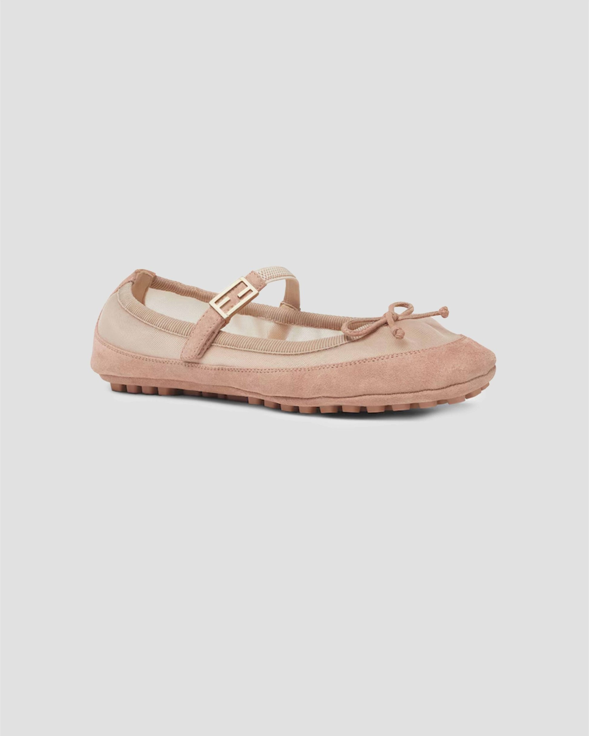 Elegant and feminine, these Fendi ballet flats blend timeless style with modern details. Crafted from pink mesh and suede, they feature a delicate bow on the topline and a gathered heel for a refined touch. An elastic strap adorned with the iconic Baguette FF motif ensures a secure fit, while the suede sole with raised rubber inserts provides comfort and durability. Finished with gold-tone metal accents, these flats are the perfect balance of luxury and everyday wearability.