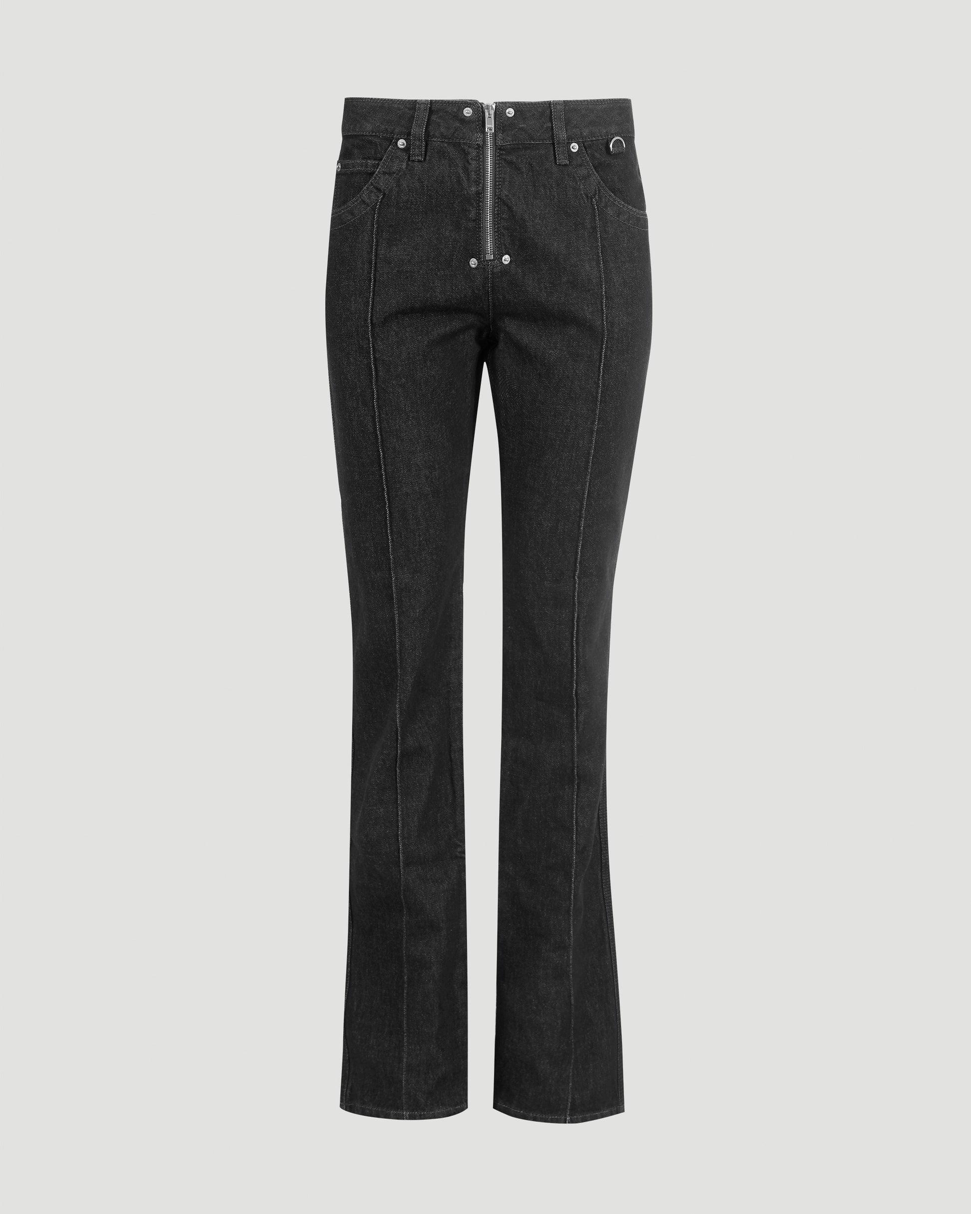 This straight-leg denim jean by Isabel Marant is crafted with a medium-rise waist and a fitted waistband with belt loops. It features a visible zip fastening, five-pocket construction, ribbed front detailing, contrasting topstitching, metal rivets, and a leather logo label at the back.