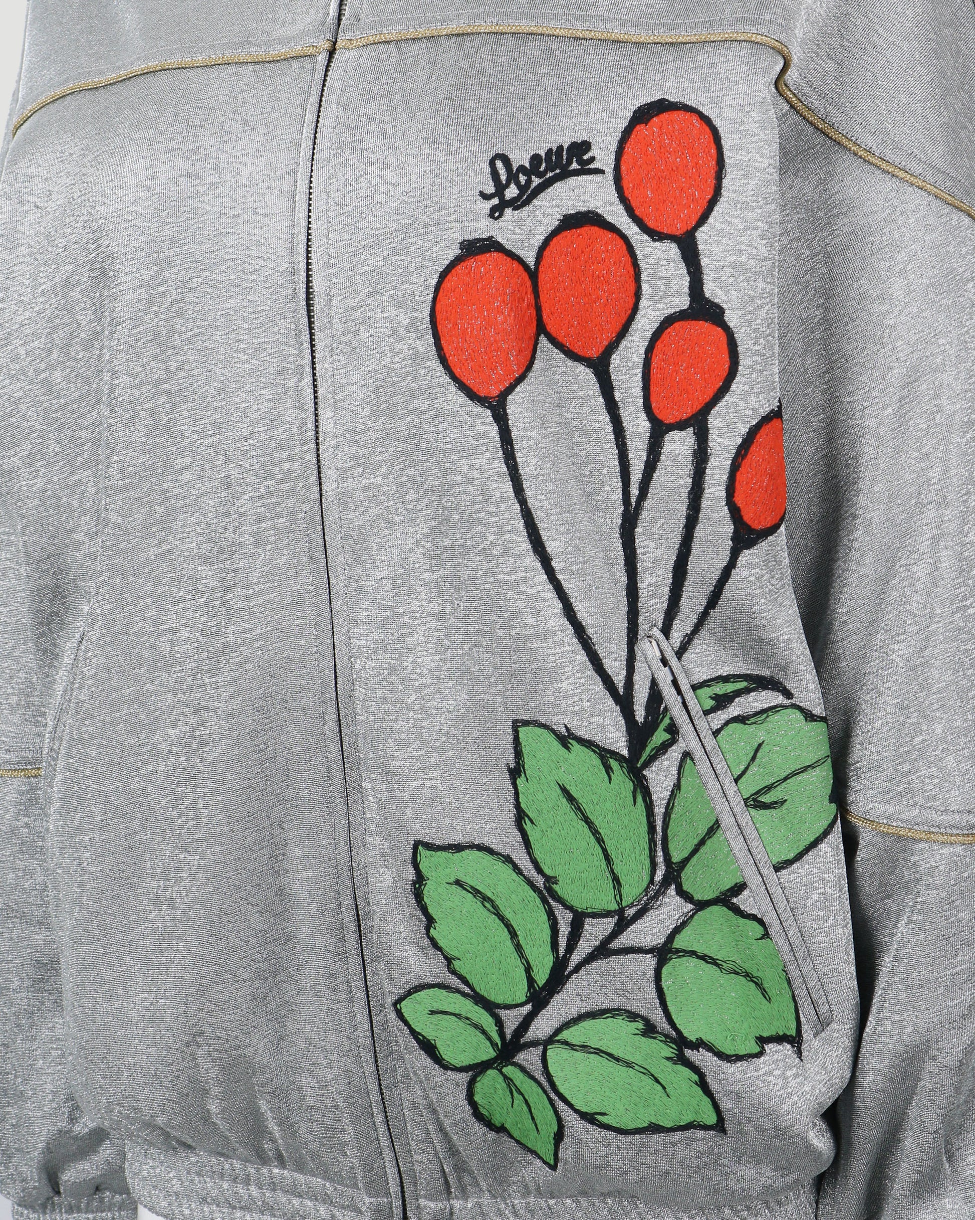 This eye-catching tracksuit jacket is impossible to miss. Made from a sparkling silver lurex jersey fabric, it features a high neck front zip, 2 side zip pockets and an elasticated hem and cuffs. Decorated with a large herbarium embroidery on one side, gold piping and the Loewe logo.
