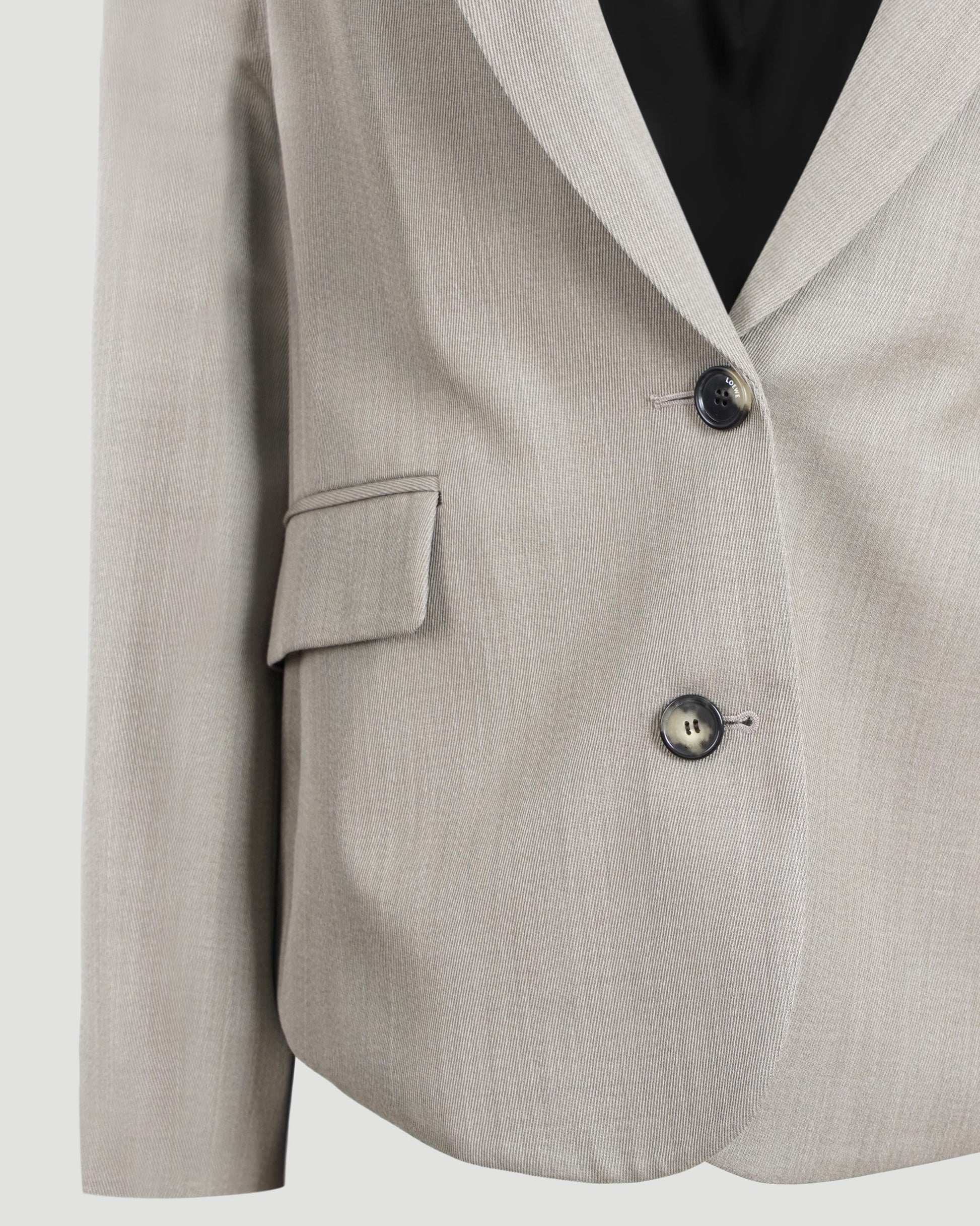 Loewe jacket in lightweight fluid wool tailoring, cut in a single-breasted silhouette with a gathered back and leather belt detail. Designed with a notch lapel, button front fastening, and split cuffs. Features a chest welt pocket, flap pockets, and a full lining.