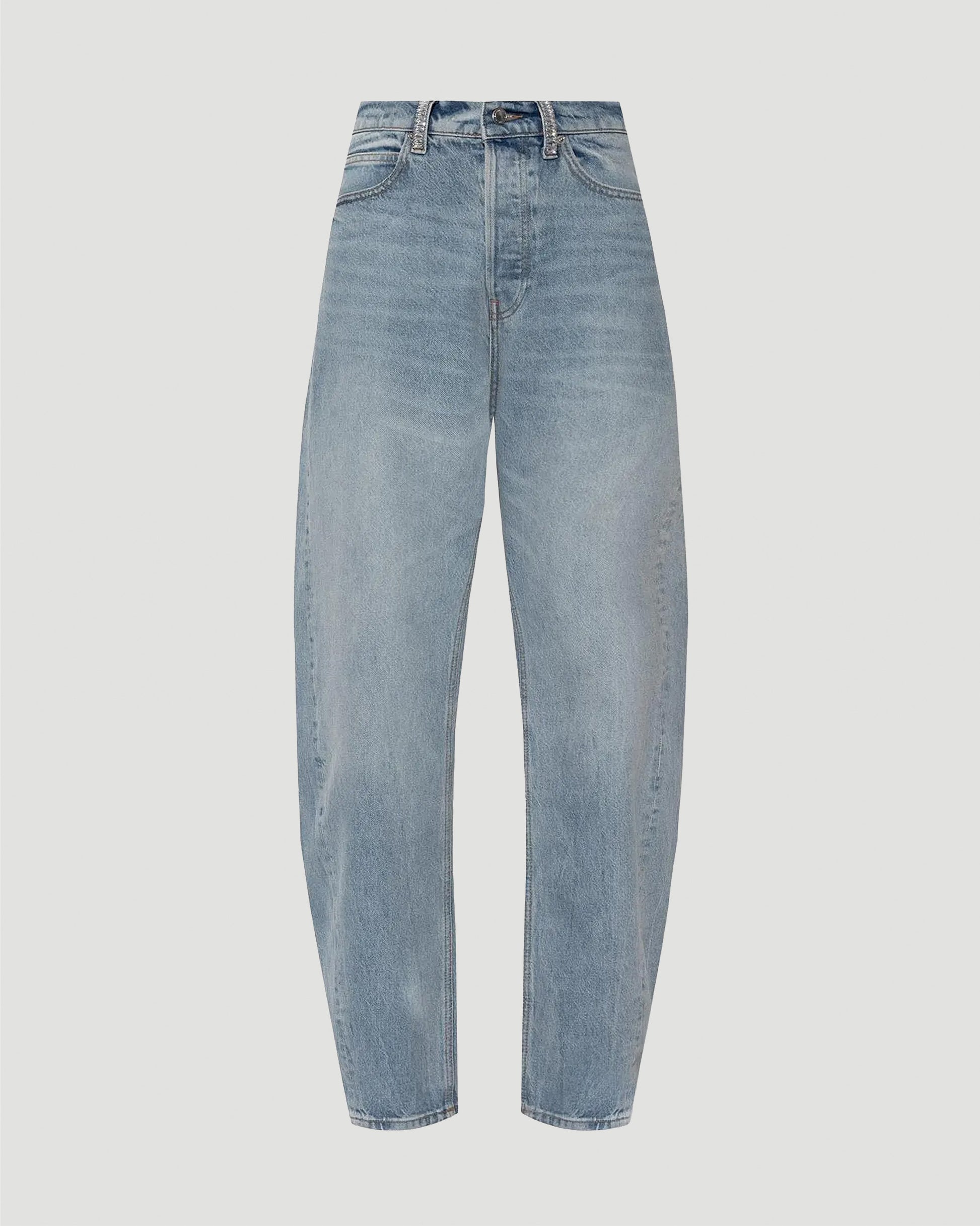 These vintage bleach blue denim jeans are crafted from cotton and feature hand-applied crystal hotfix belt loops. Designed with a mid-rise relaxed silhouette, they include a five-pocket construction, zip fly with front closure, and a subtle embossed logo at the back pocket.