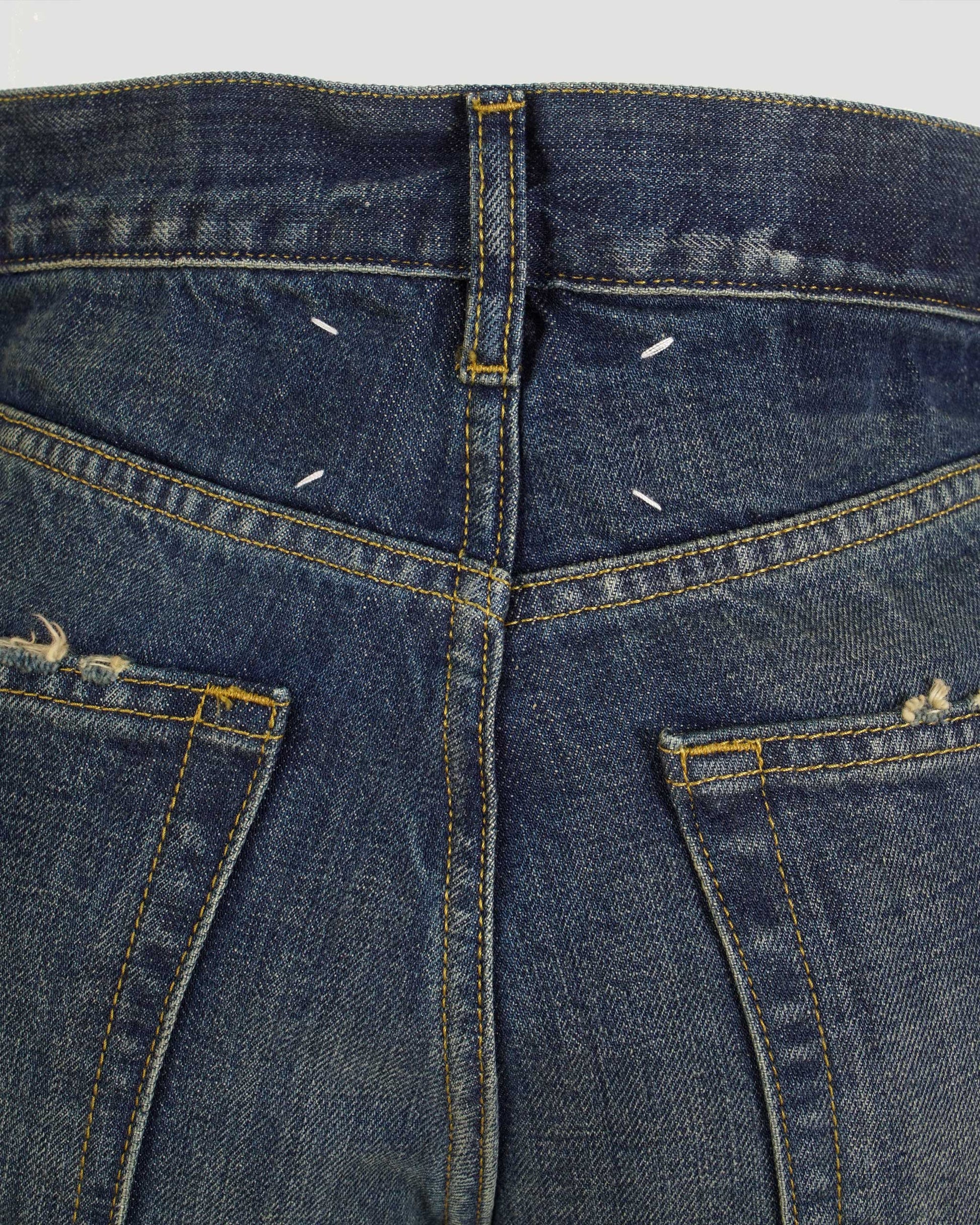 Straight-leg jeans by Maison Margiela, crafted from washed denim. Designed with a mid-rise waist, belt loops, button fastening, and classic five-pocket construction. Finished with raw edges at the cuffs for a deconstructed look.