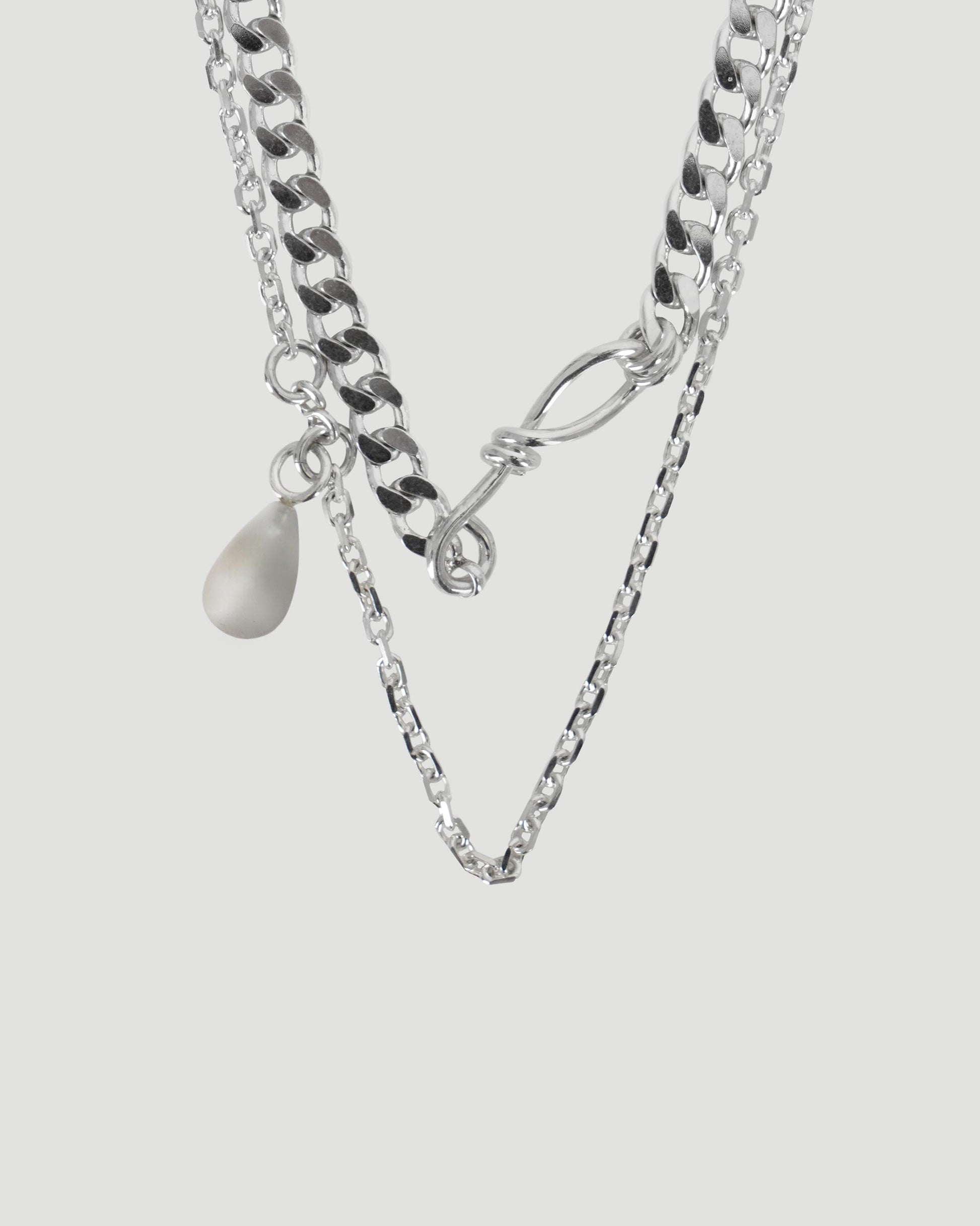 This necklace by Milko Boyarov features a layered silver chain design with a teardrop-shaped charm and a distinctive spoon-shaped detail.