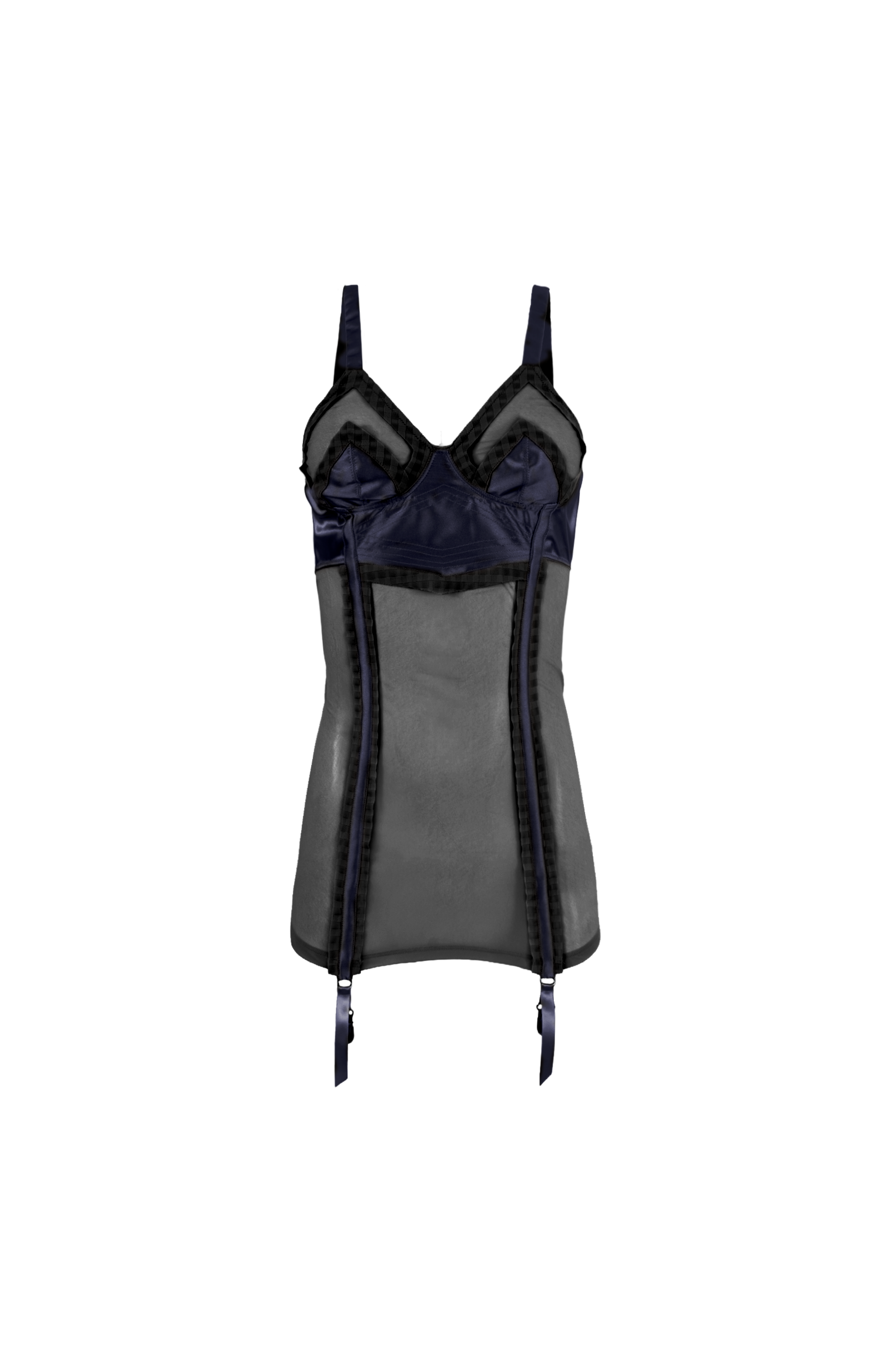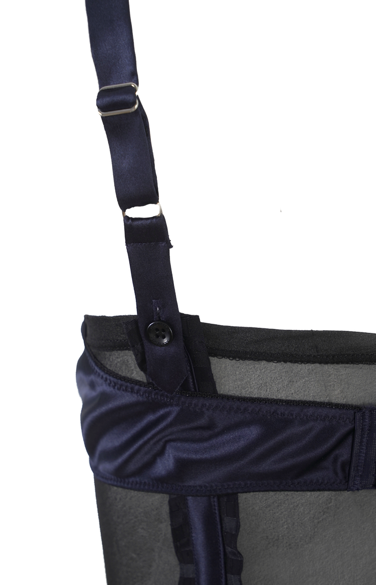 This corset top by Julie Kegels is crafted from satin. It features adjustable shoulder straps, structured panel construction, lace trim detailing, and attached garter straps.