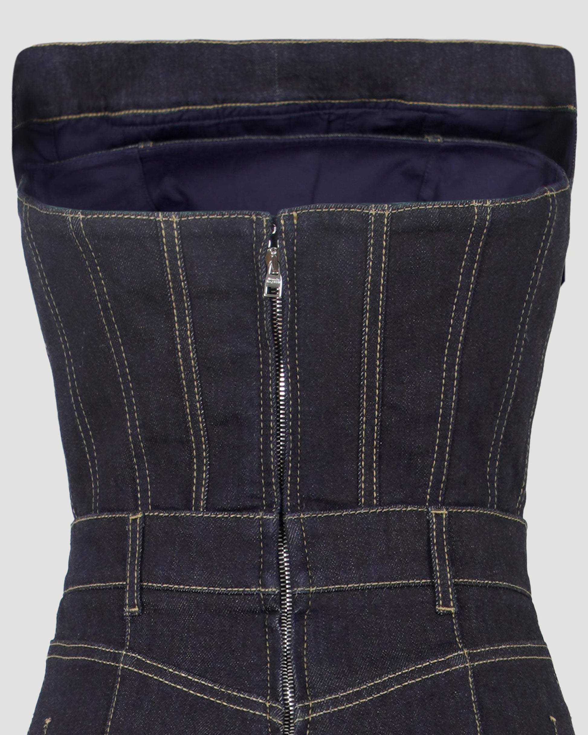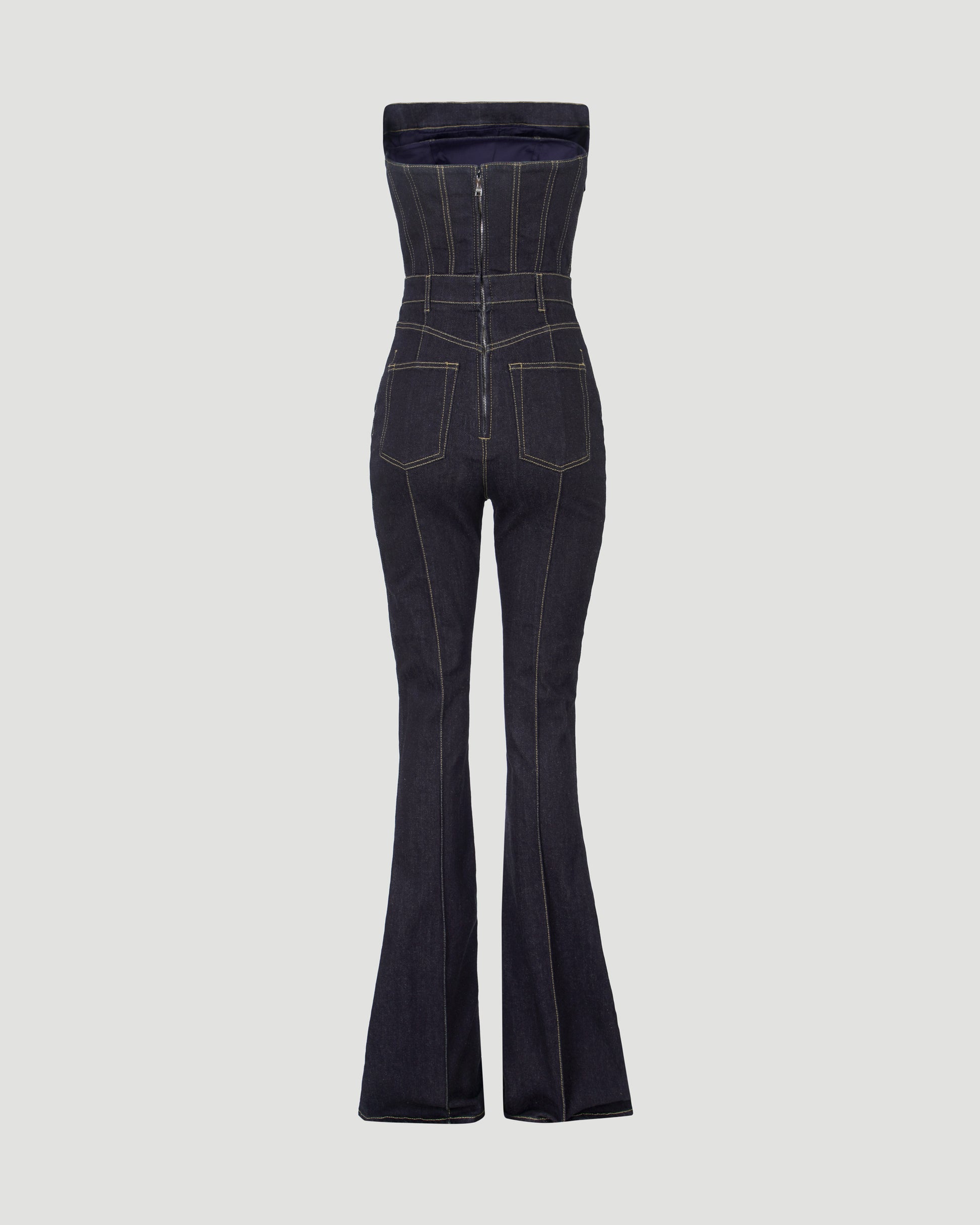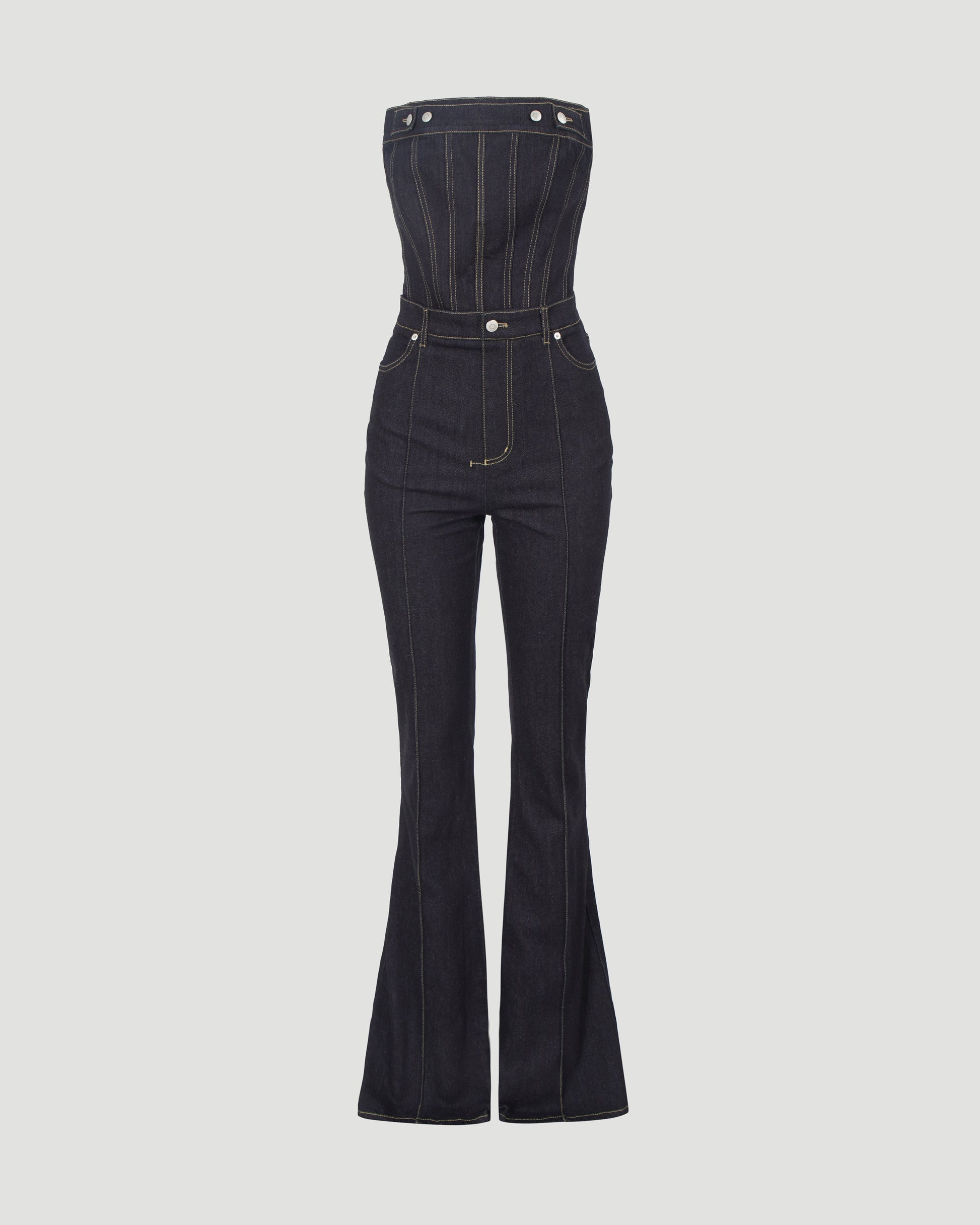 A stunning jumpsuit from Alexander McQueen. Cut from cotton denim, this piece has integrated corset that will give you flattering silhouette. Featuring flared legs, zip & fly closure, belt loops and zipper at corset.