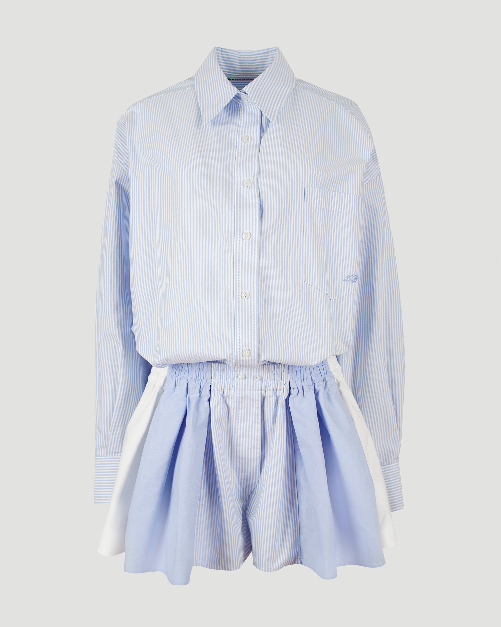 Experience effortless sophistication with this striped jumpsuit by Alexander Wang. Crafted from premium cotton for breathability and comfort, it features an oversized shirt silhouette that flows into a pleated mini skirt, blending sporty ease with refined style. The light blue striped pattern, accented with white on the skirt, lends a fresh, modern look, while subtle details like the embroidered logo on the chest and concealed buttons highlight its understated luxury.