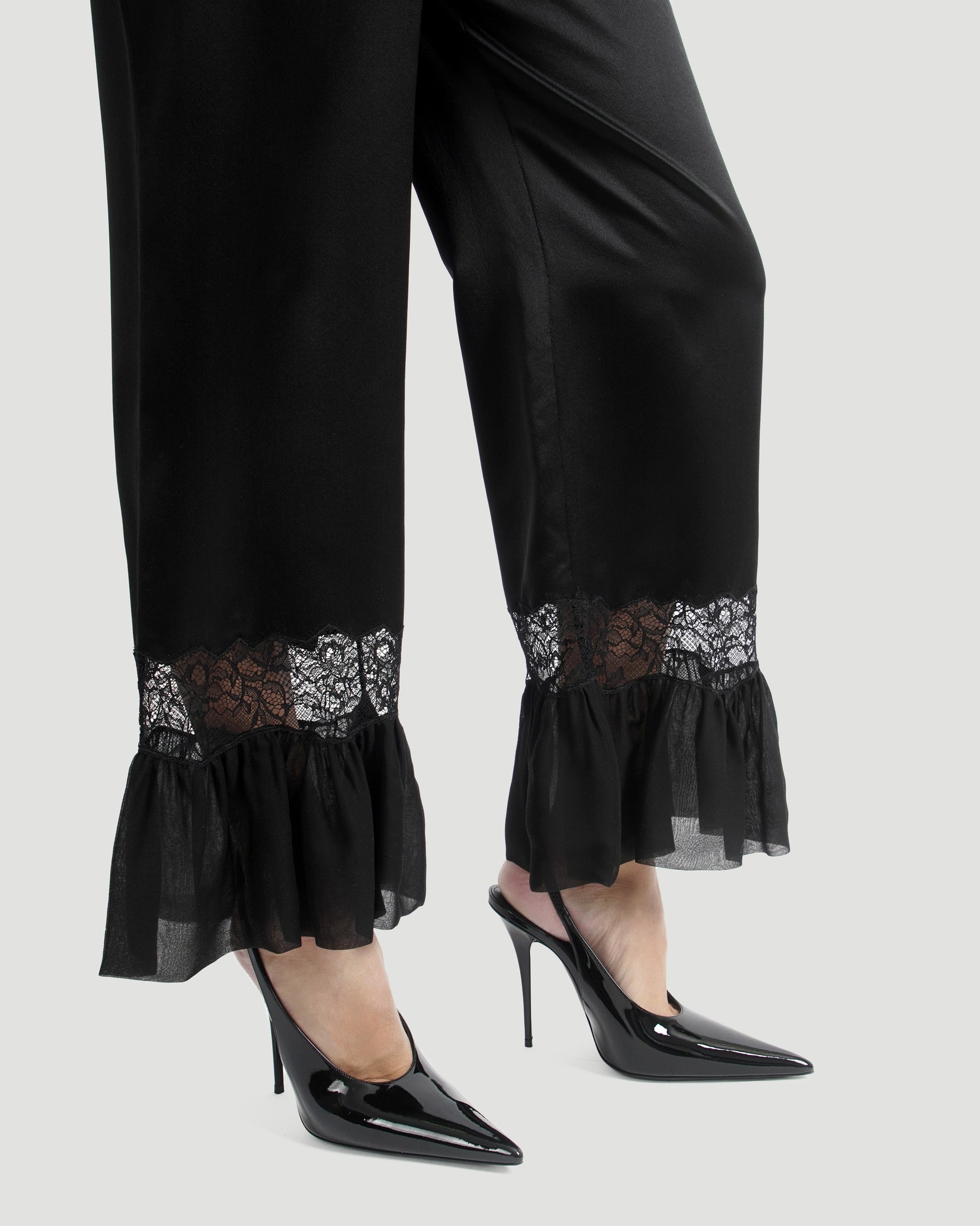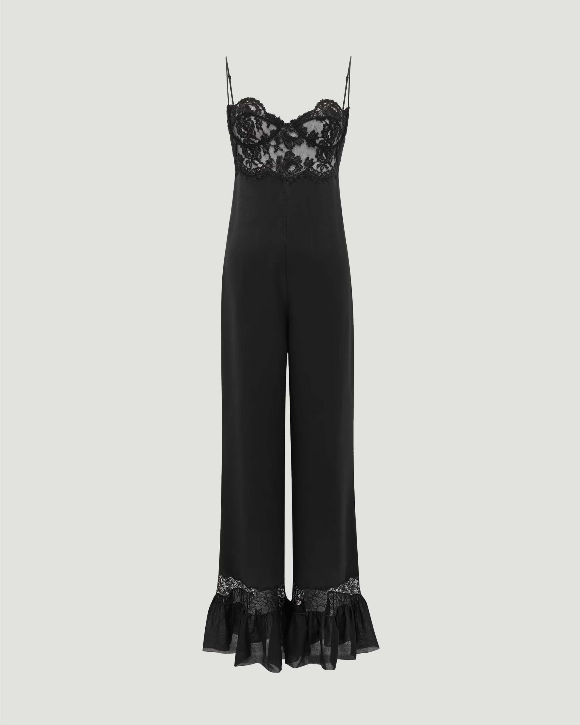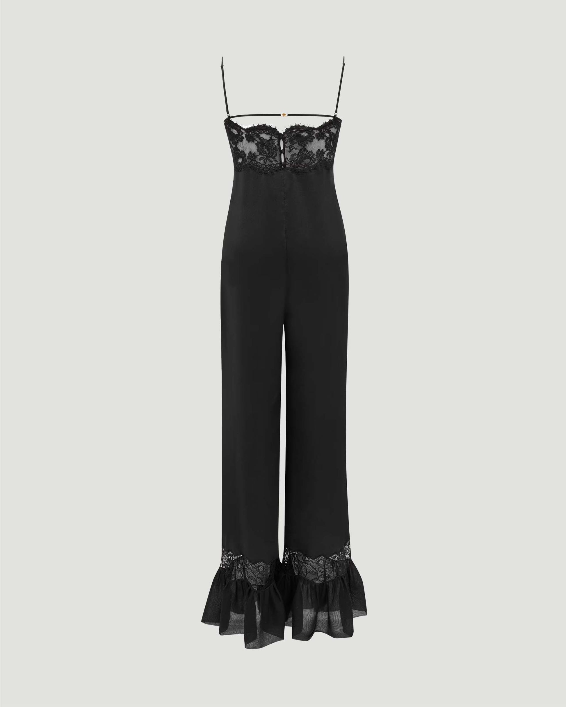 This luxurious Saint Laurent jumpsuit is crafted from silk, featuring a stunning scalloped lace bodice with demi-cup underwire boning for a flattering, structured fit. It has adjustable spaghetti straps for comfort and tailored pants with elegant ruffled cuffs, adding a soft, feminine touch. The design is finished with a secure latch clasp and button closure at the back, offering a perfect blend of sophistication and allure.