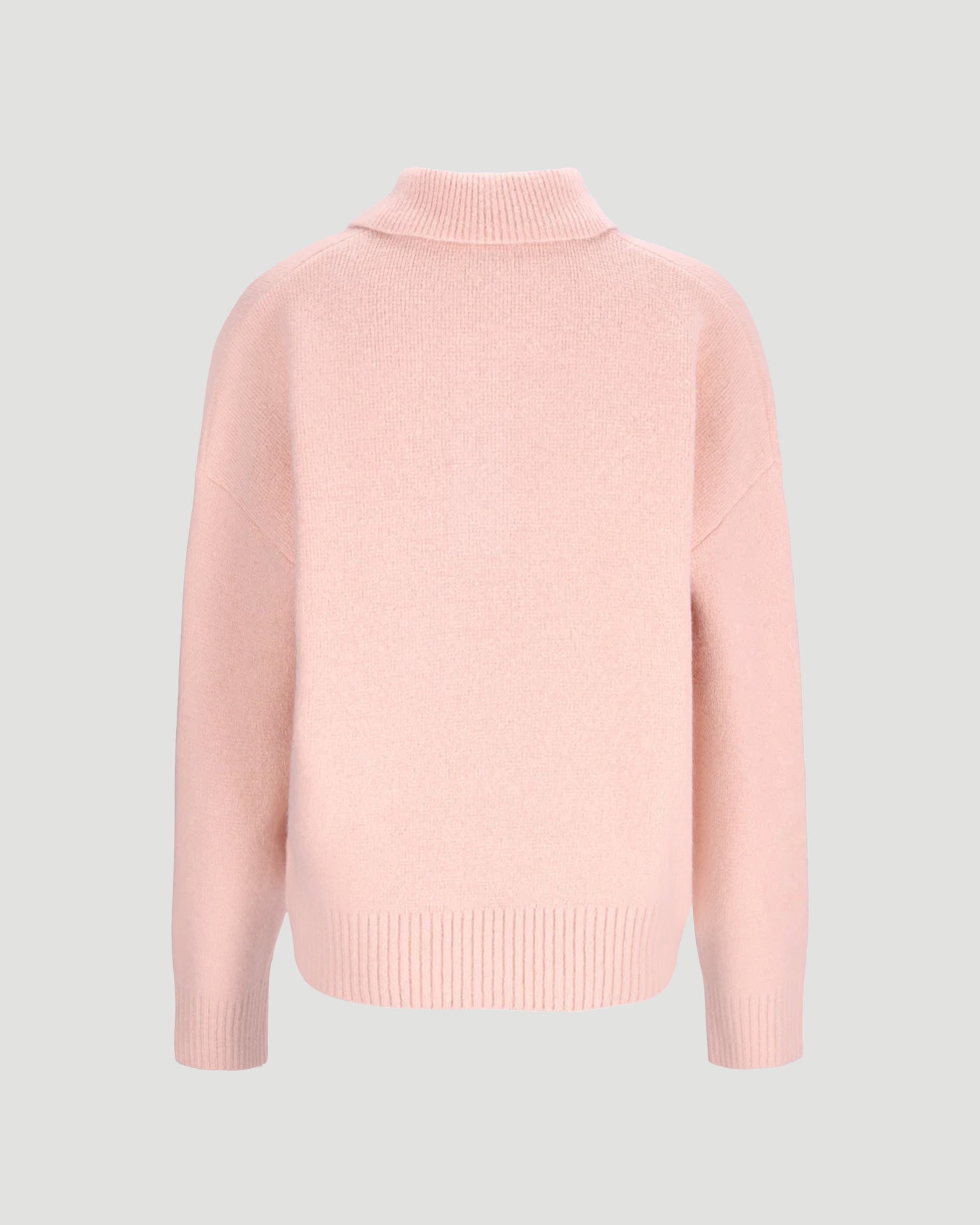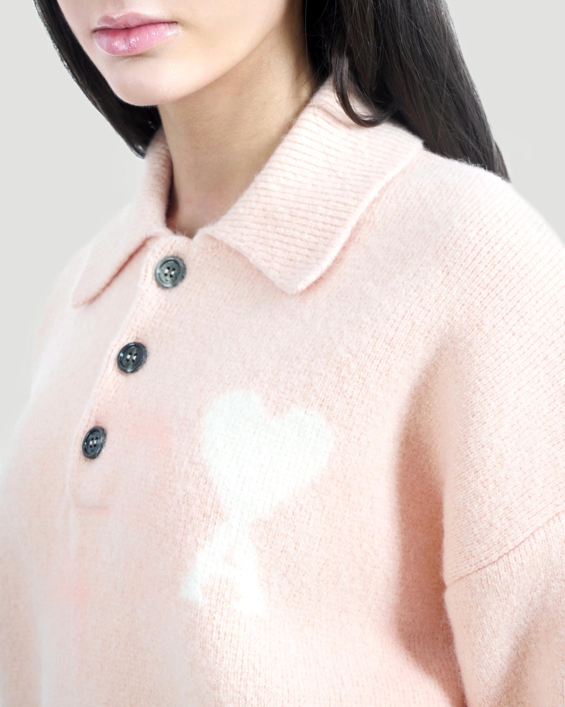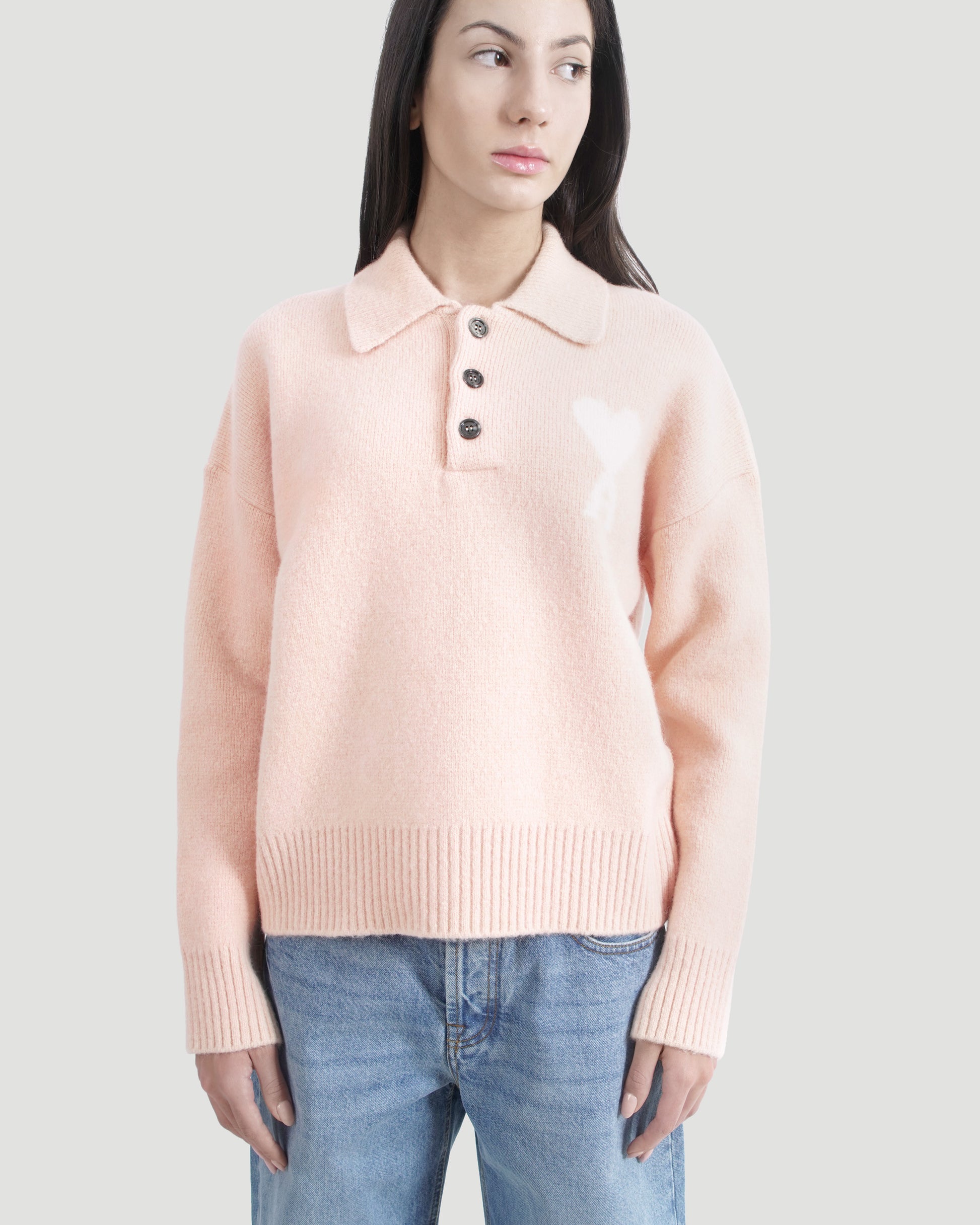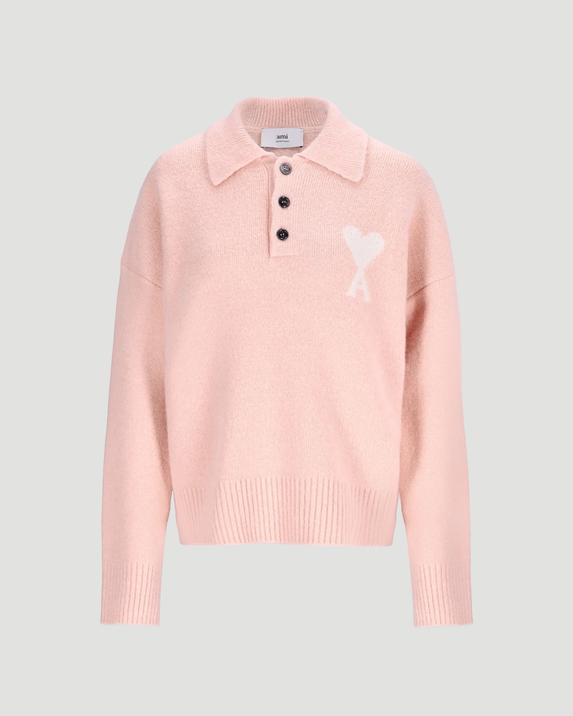 This AMI polo sweater in soft alpaca knit features an intarsia-knitted Ami de Cœur on the chest and an interlock stitch finish. Cozy texture with signature detailing.