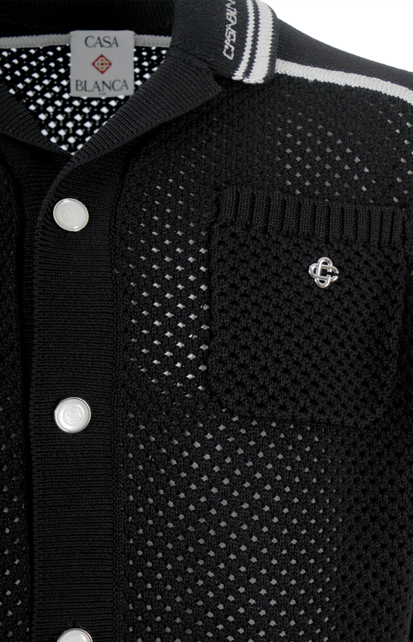 This short-sleeve mesh shirt by Casablanca is crafted from a cotton blend mesh fabric. It features striped detailing across the shoulders and sleeves, a Cuban-style collar with striped edge detail, and front button closure with silver-rim enamel buttons. A breast pocket with a silver-plated interlocking CC logo rivet completes the design.