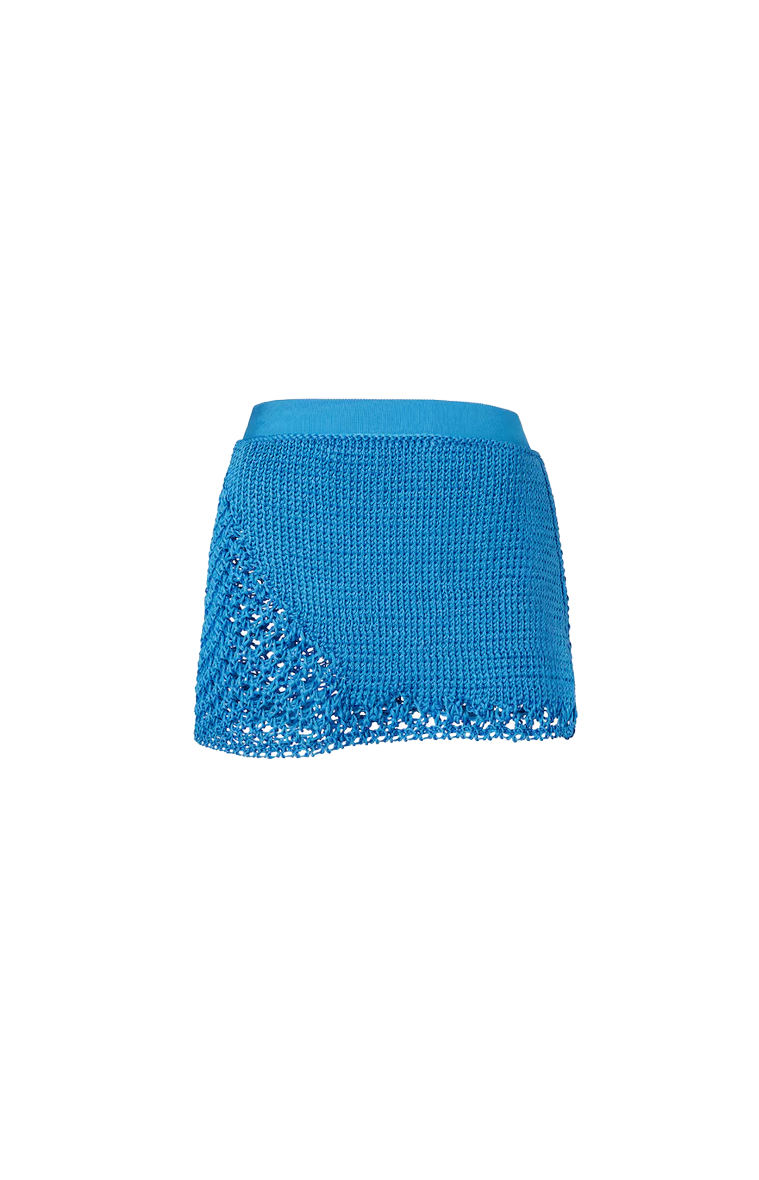 Mini skirt with elastic waistband. Made of light blue silk yarn in a chunky, irregular macramé knit.