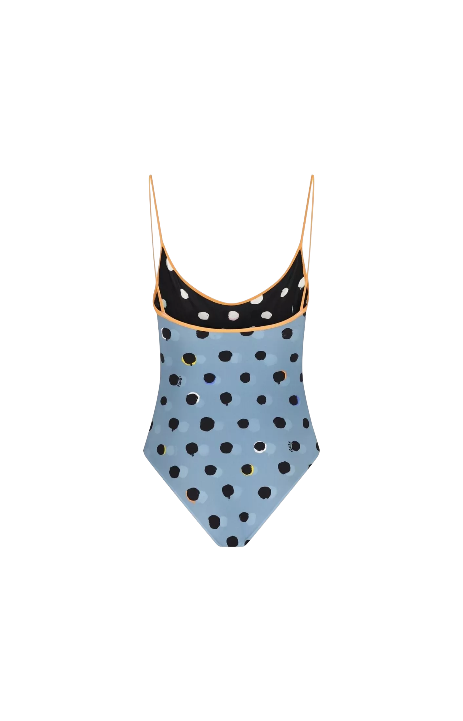 This swimsuit by Fendi is crafted with a polka dot print and contrasting trim. It features spaghetti straps, a V-neckline, and a low back. Made in Italy.