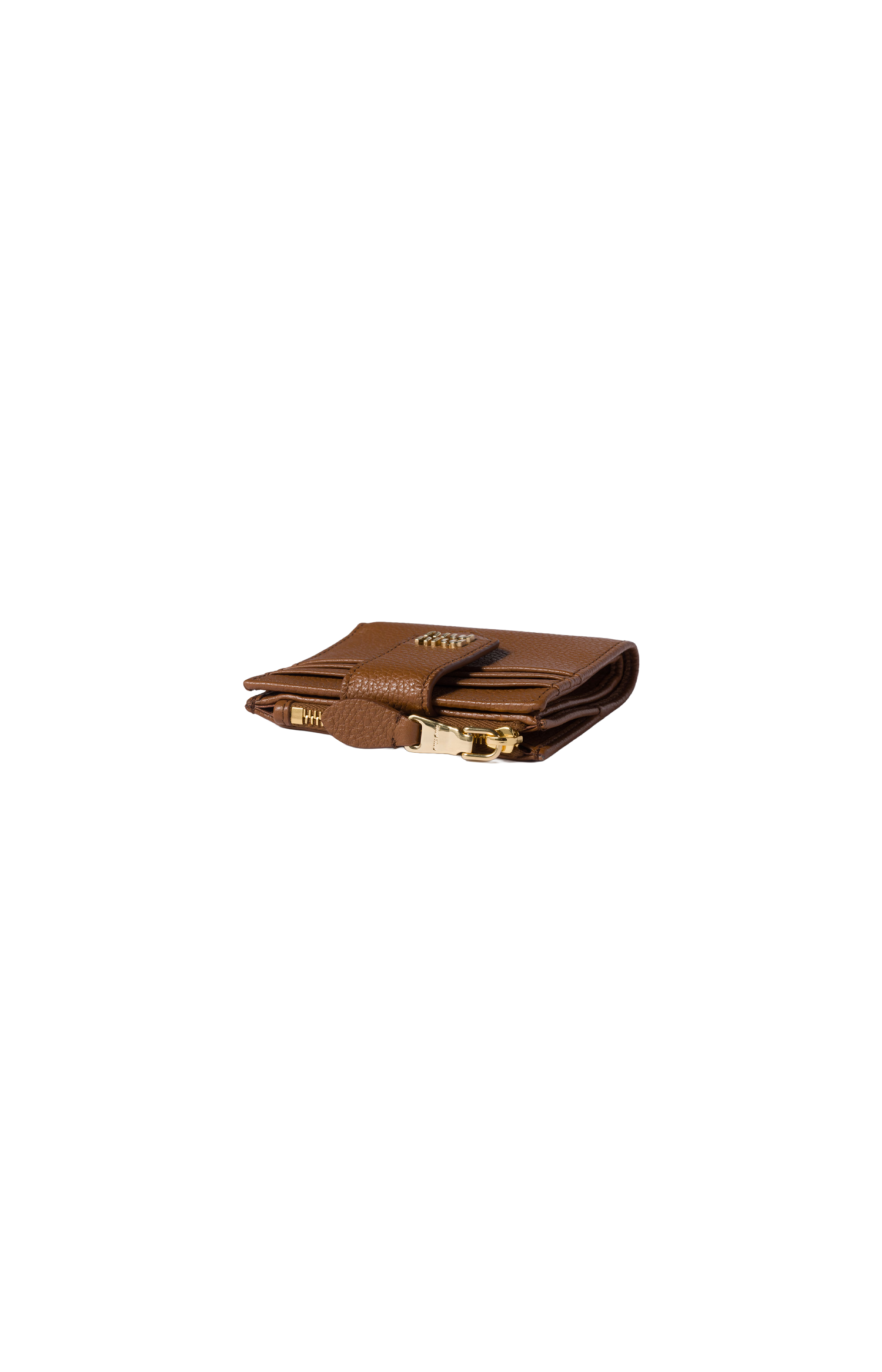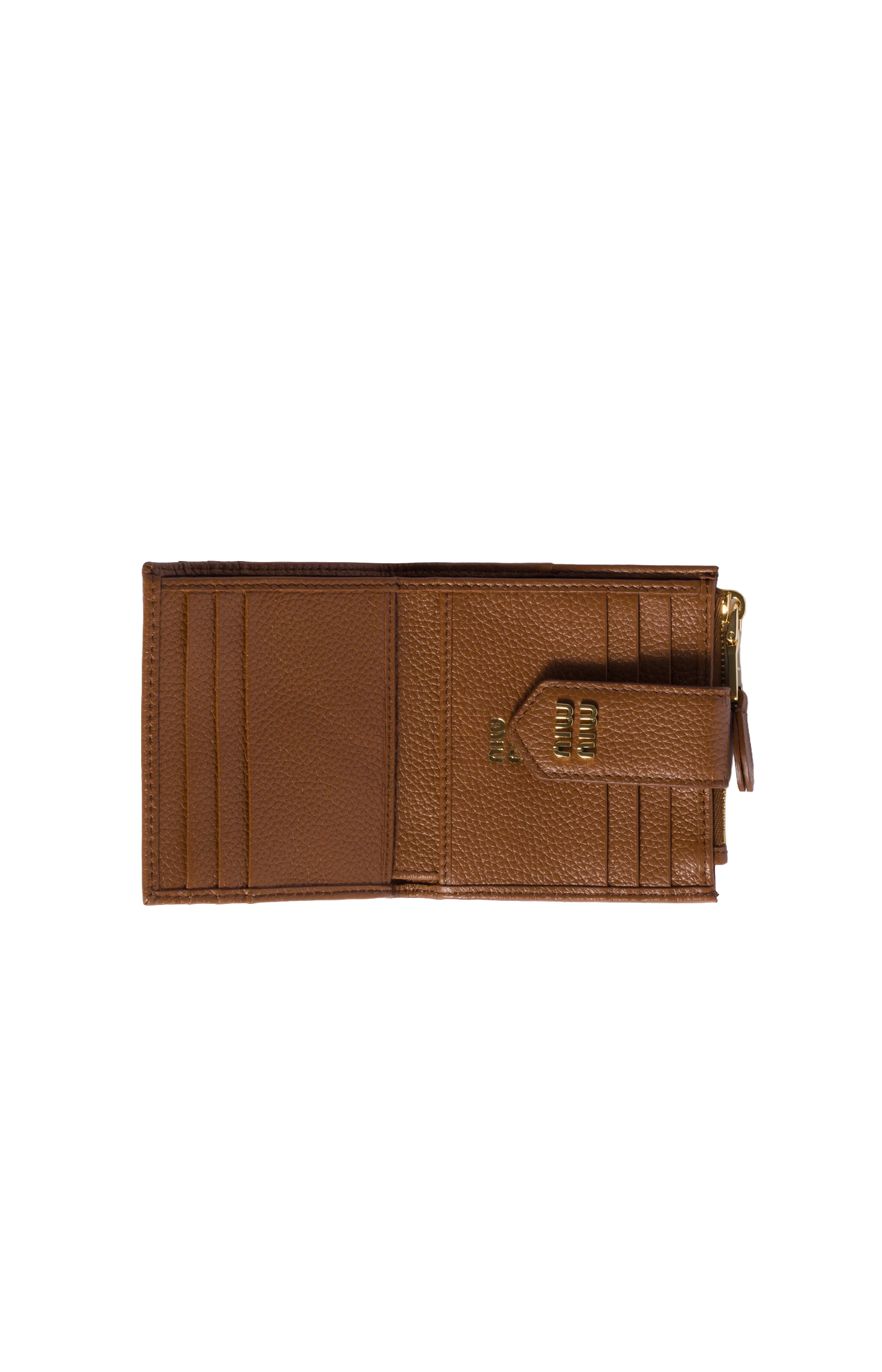 This wallet by Miu Miu is crafted in leather with a compact silhouette. It features six card slots, a bill compartment, three internal pockets, a zip coin pocket, and zip and snap closure with metal logo lettering.