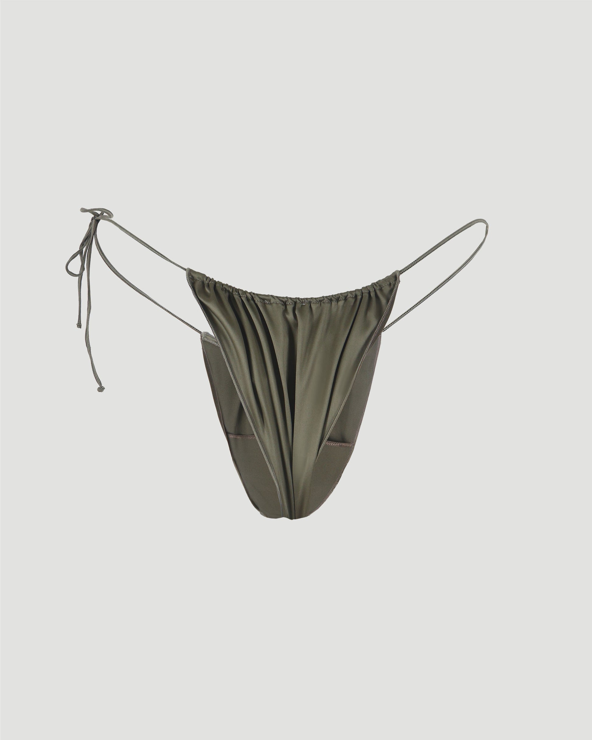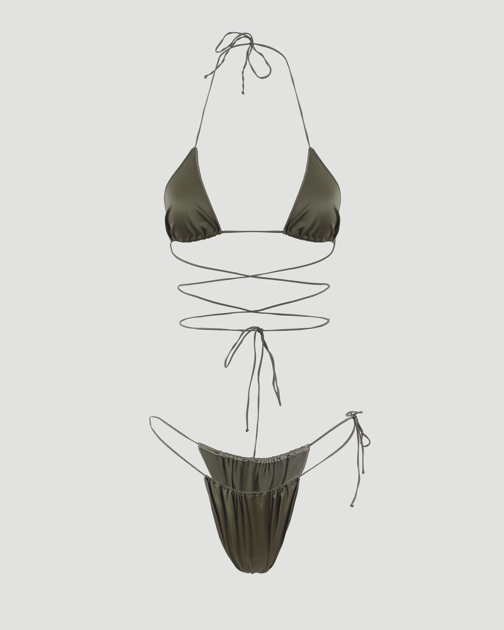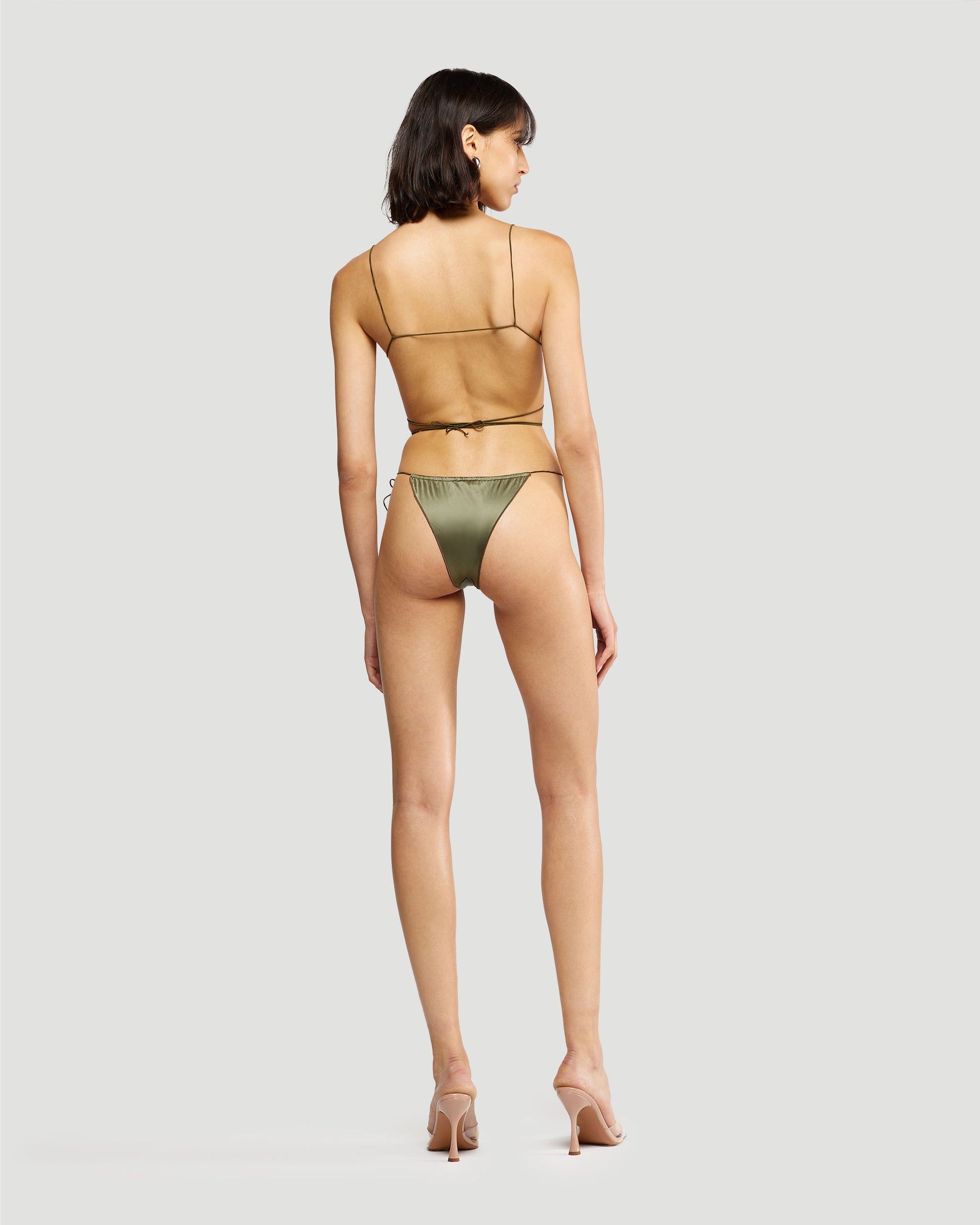 Stand out on your next beach holiday with this bikini by Oséree. In a green satin material, it features a minimalistic self-tie design, with triangle cups and classic coverage bottoms.