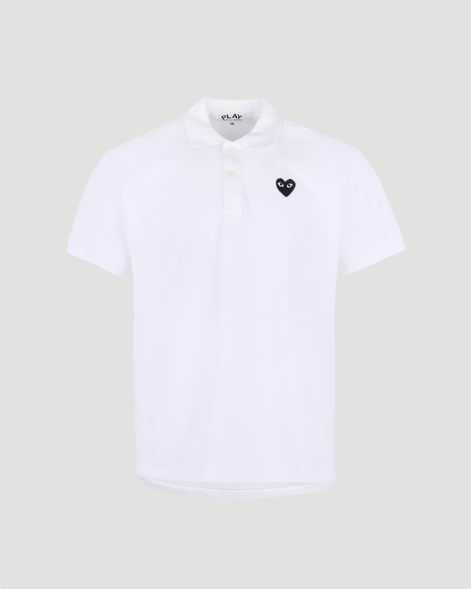 Classic polo shirt by PLAY Comme des Garçons. Crafted from cotton in a crisp white color, it features a classic collar, with a button placket, short sleeves, and the brand's iconic heart logo embroidered at the chest.