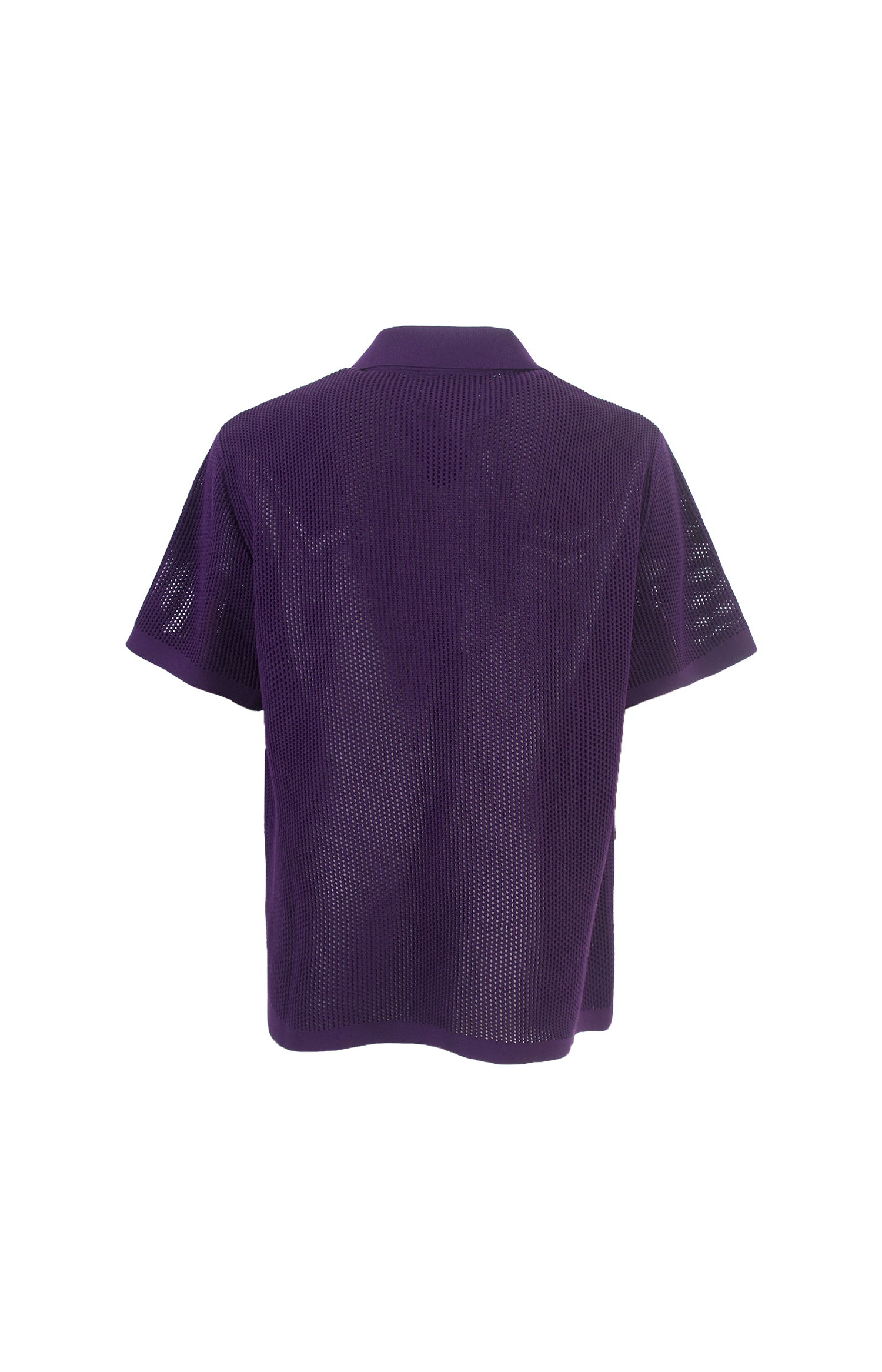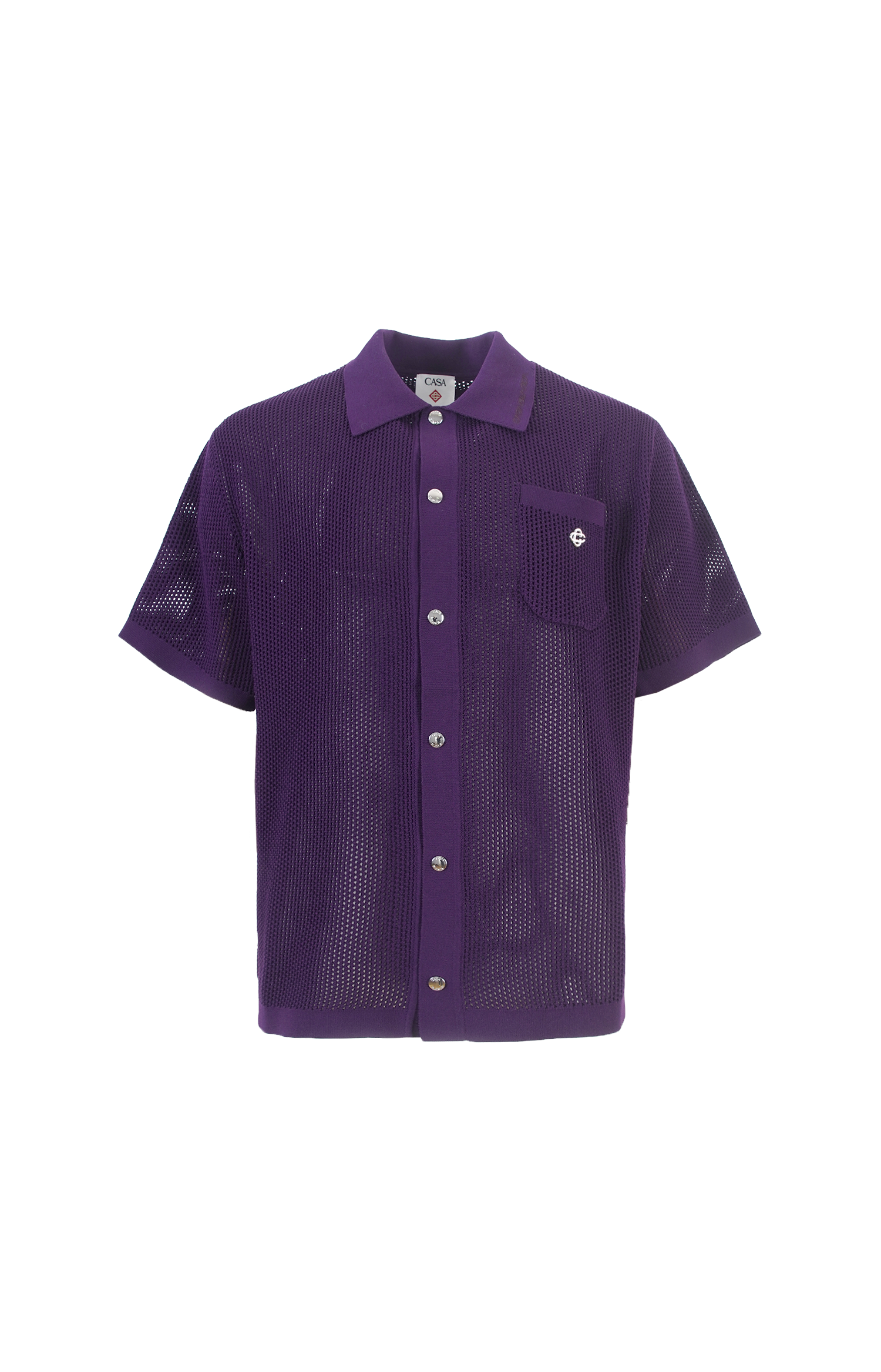 This short-sleeve shirt by Casablanca is crafted from open-knit mesh fabric in a relaxed silhouette. It features a classic pointed collar, a front button closure with metallic buttons, and ribbed trims at the collar, cuffs, and hem. Designed with a chest patch pocket accented by the house’s signature monogram detail, the breathable construction lends a refined yet effortless appeal.