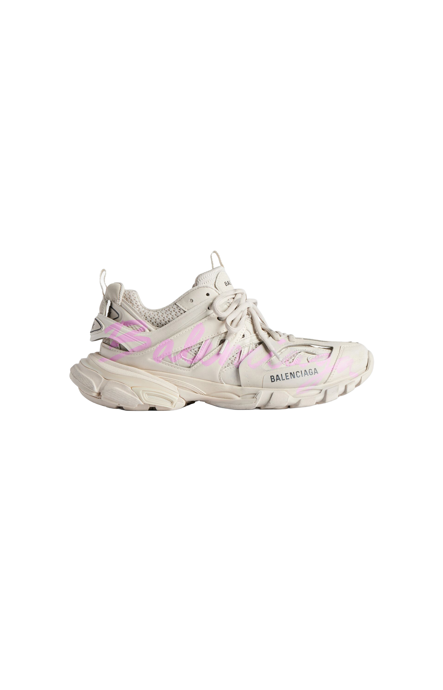 These leather-free sneakers by Balenciaga are crafted from polyurethane and polyester. They feature a written size at the toe edge, Track debossing at the back of the heel, a BB logo on the front of the outsole, signature artwork and printed Balenciaga logos on the exterior, and a debossed logo on the tongue. Finished with double knotted laces, pull tabs at the tongue and heel, a dynamic sole design with an augmented back, and an additional pair of laces included.