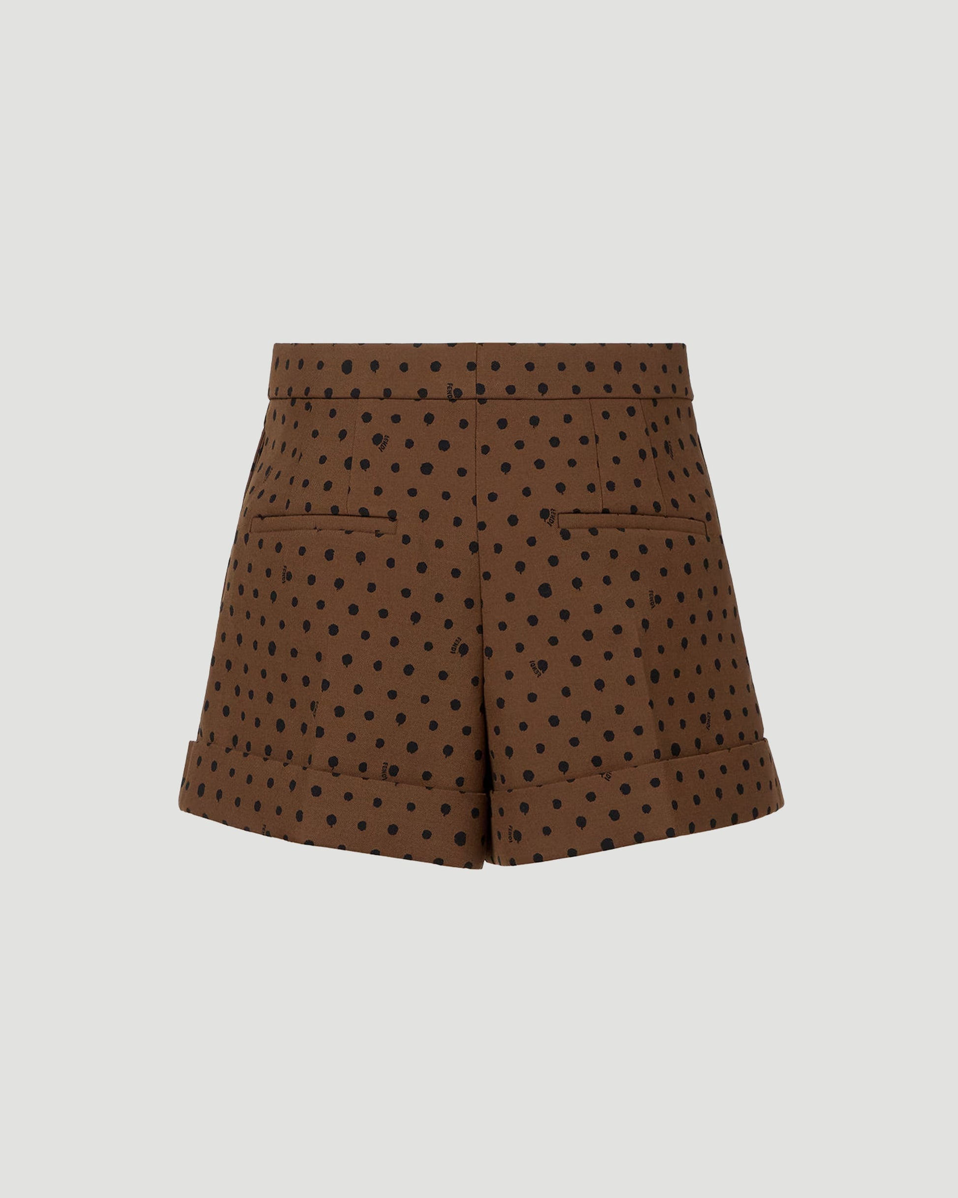 This flared shorts by Fendi is crafted from wool with an all-over contrasting Falena Dots print. Designed with double front pleats, it features side pockets, turned-up hem, and concealed zip and hook fastening. Made in Italy.