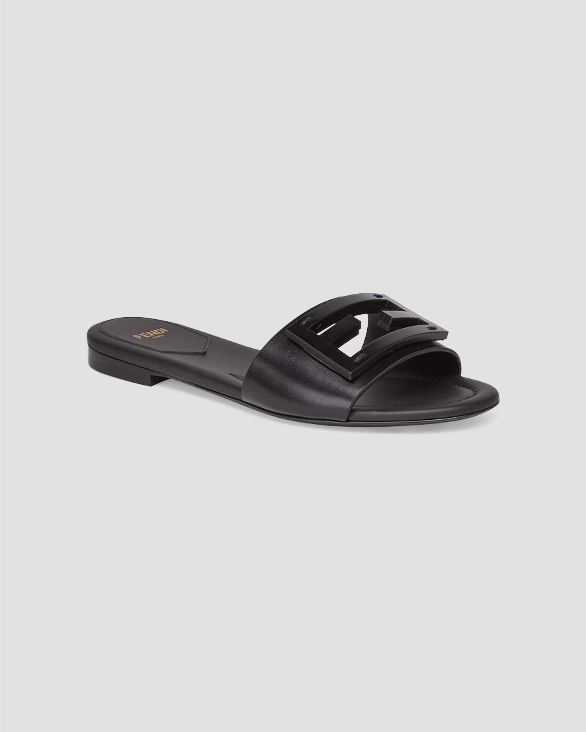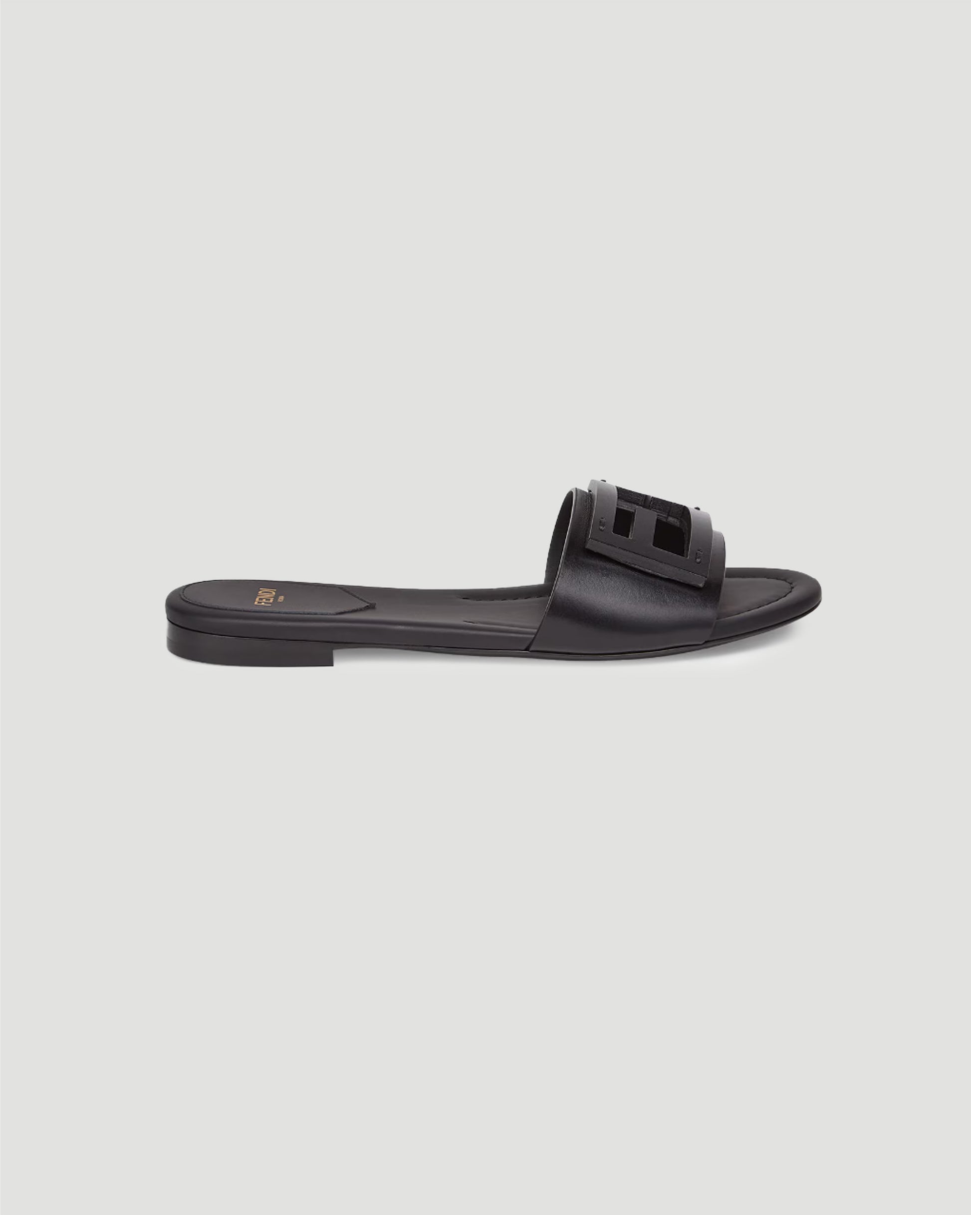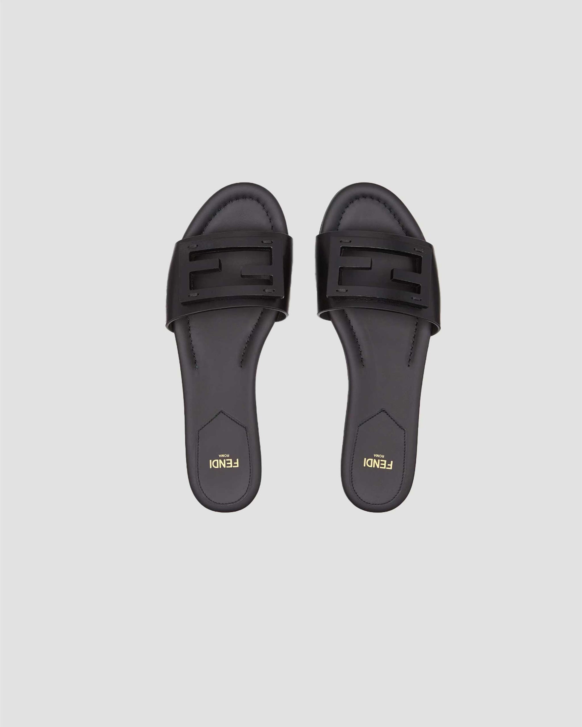 Fendi wide-band slides crafted from black leather, featuring a tonal FF Baguette motif for a sleek, minimalist look.
