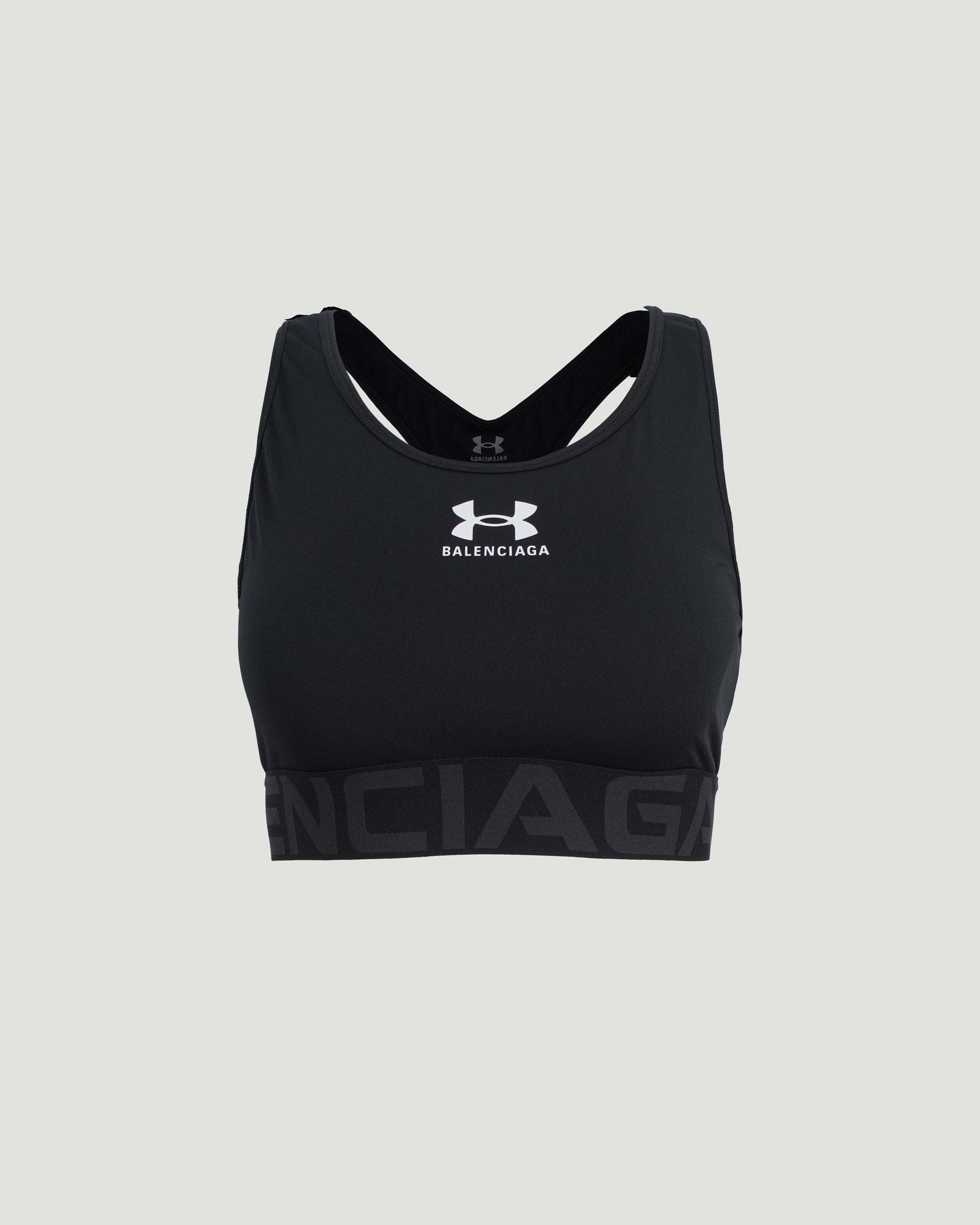 This Balenciaga x Under Armour sports bra features a bodycon fit with a sleek racer-back design for optimal support and mobility. Crafted with a stretch finish, it ensures comfort and flexibility during movement. The front is adorned with Under Armour artwork, blending performance functionality with Balenciaga's signature style.