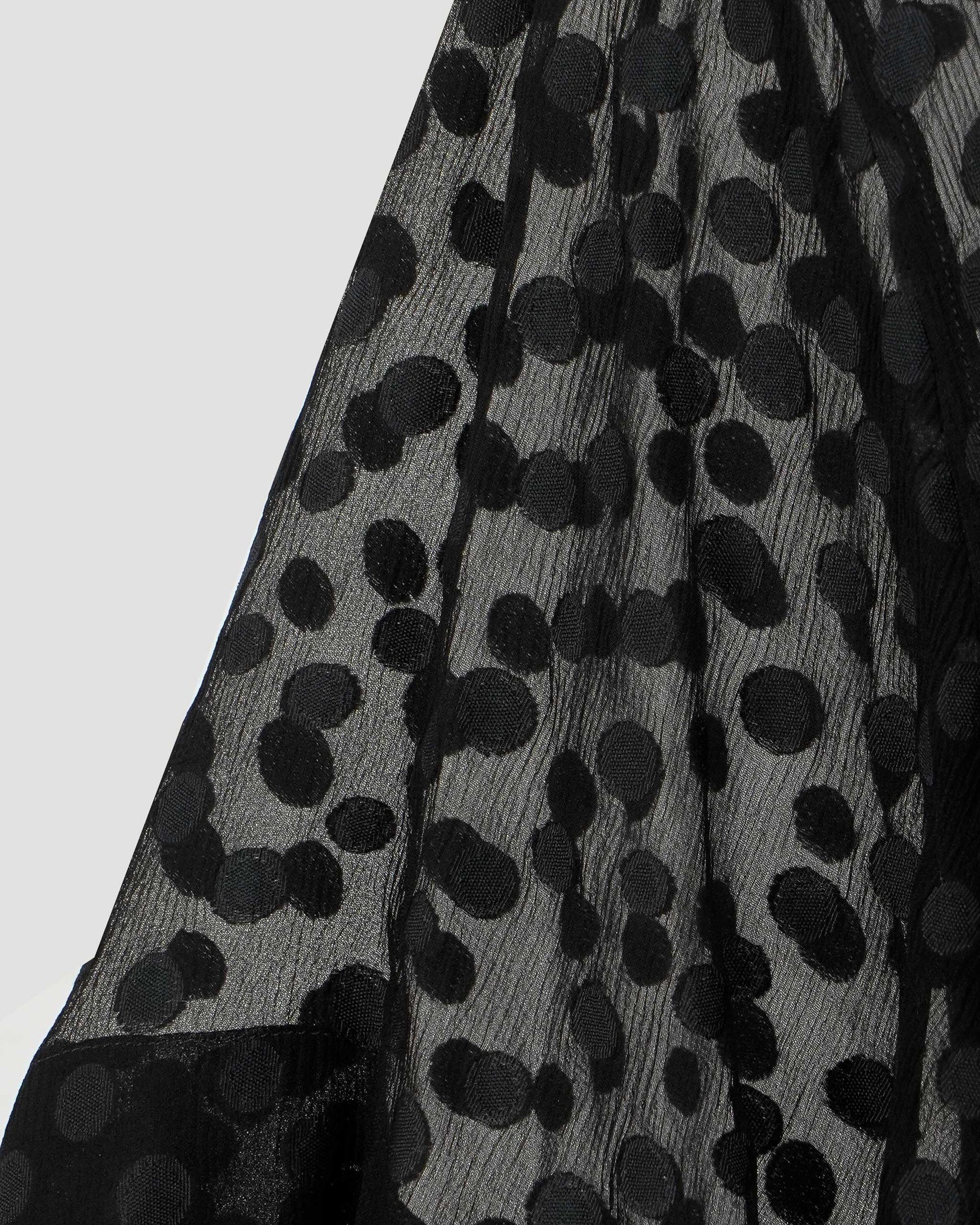 This Stella McCartney dress is crafted from lightweight crêpon silk in classic black, featuring an all-over tonal dot pattern for subtle texture. Designed with a feminine tie-neck detail, long wide sleeves, and a front button fastening, it offers an effortlessly elegant silhouette with a refined, modern finish.