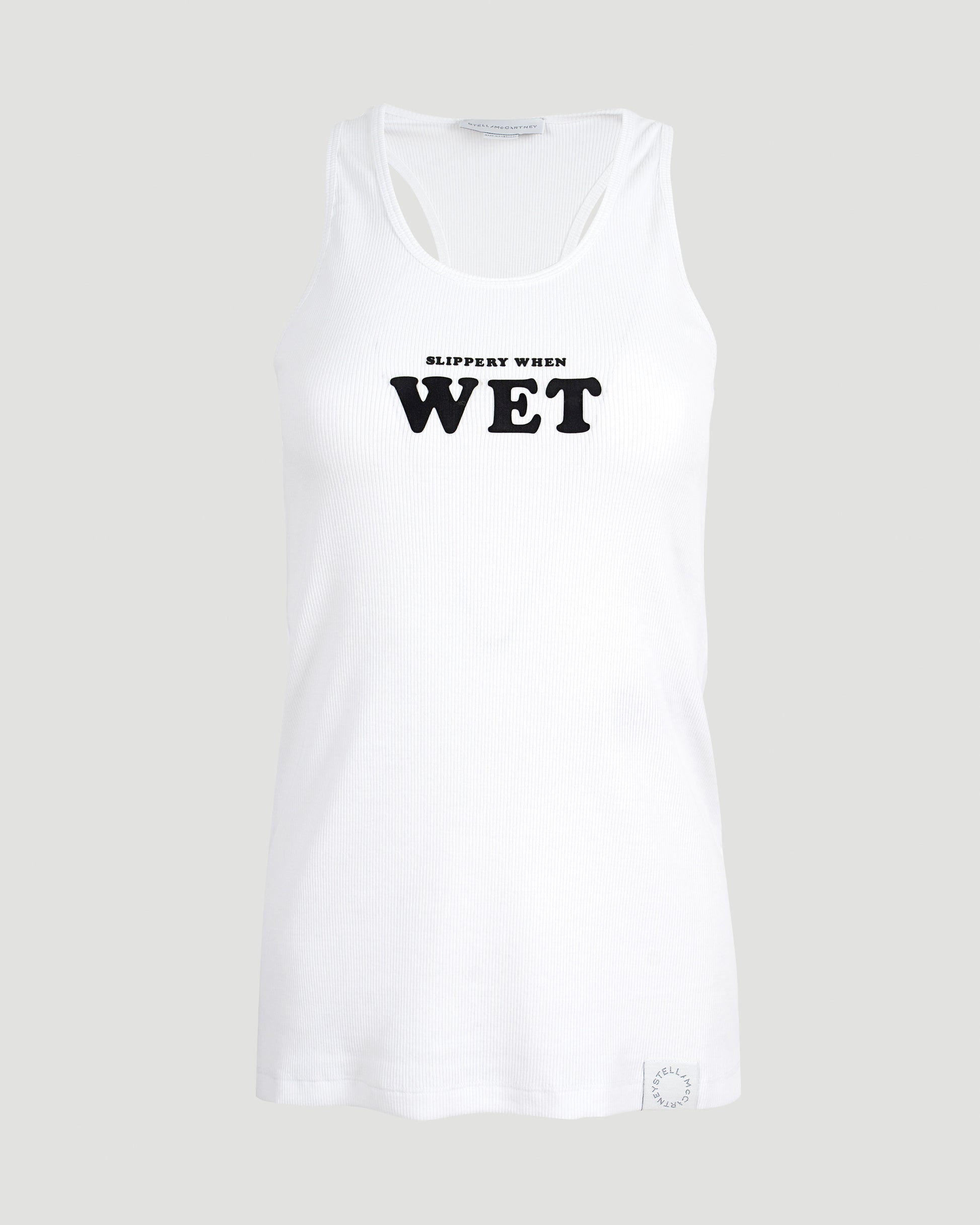 This white ribbed tank top by Stella McCartney features a playful text printed at front. Crafted from soft cotton blend with a classic racerback silhouette, it’s the perfect mix of casual comfort and statement style. Wear it solo or layered for an effortlessly cool look.