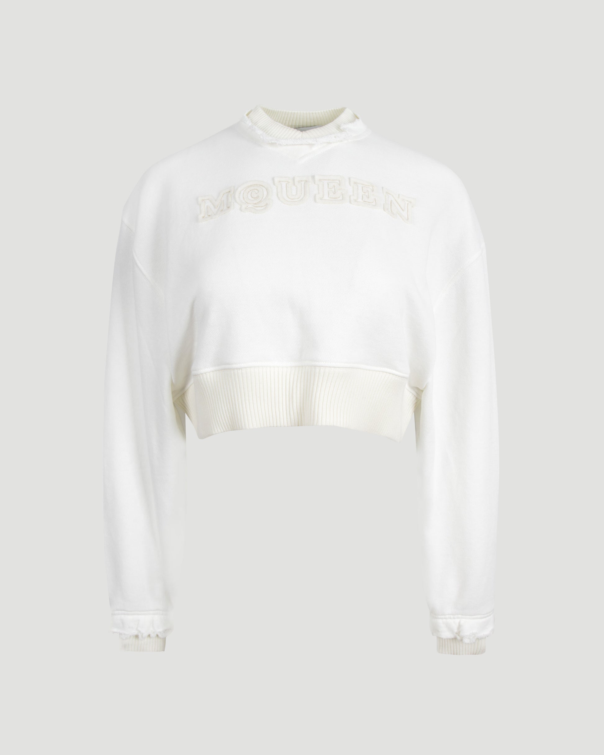This Alexander McQueen cotton hoodie offers a contemporary twist with its cropped silhouette and frayed hem. It features an adjustable drawstring hood and a bold logo at the front, blending casual style with signature edge.