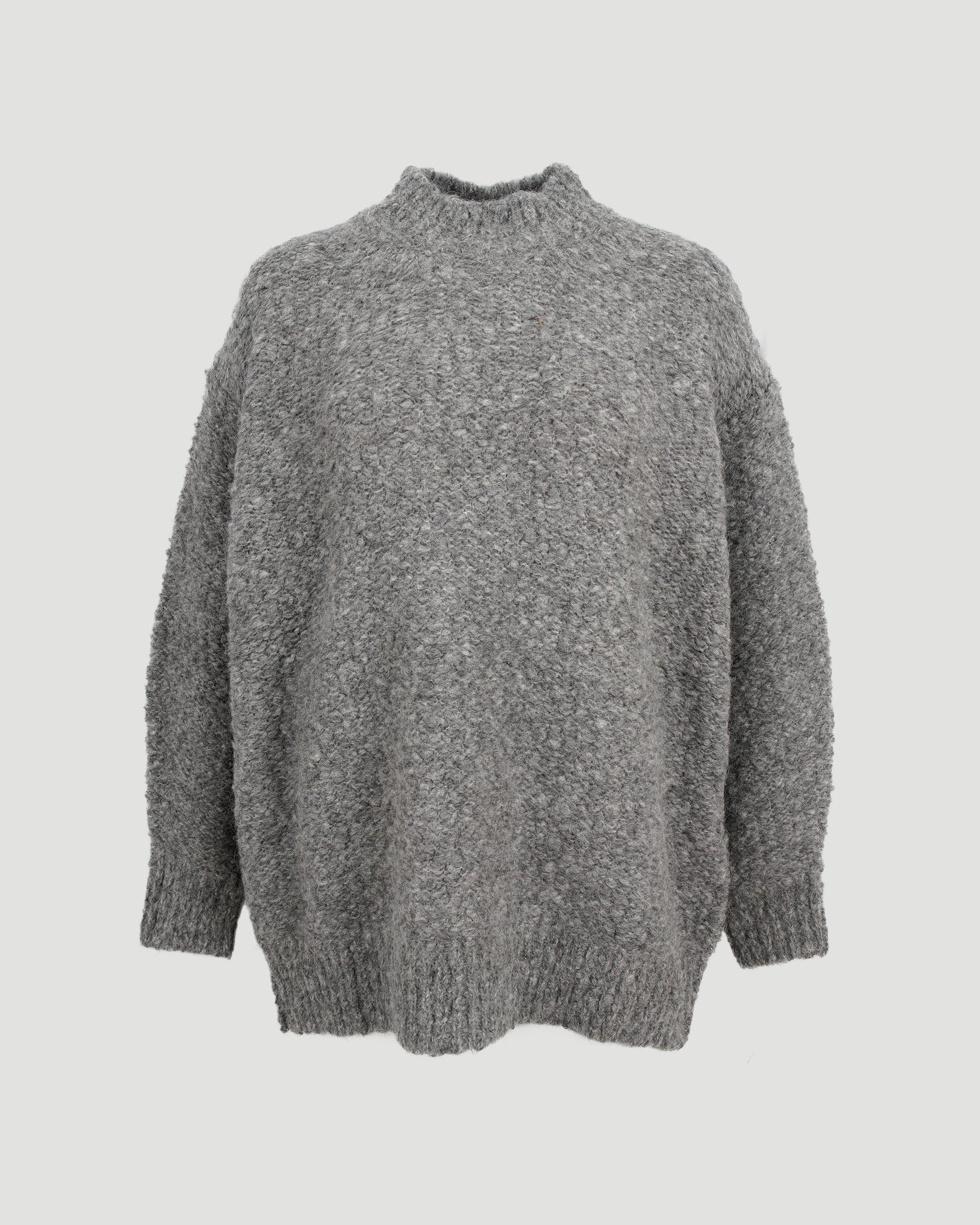 This grey jumper by Isabel Marant is knitted from a soft mohair blend, cut in a slouchy silhouette with a mock neck, long sleeves, and ribbed trims.