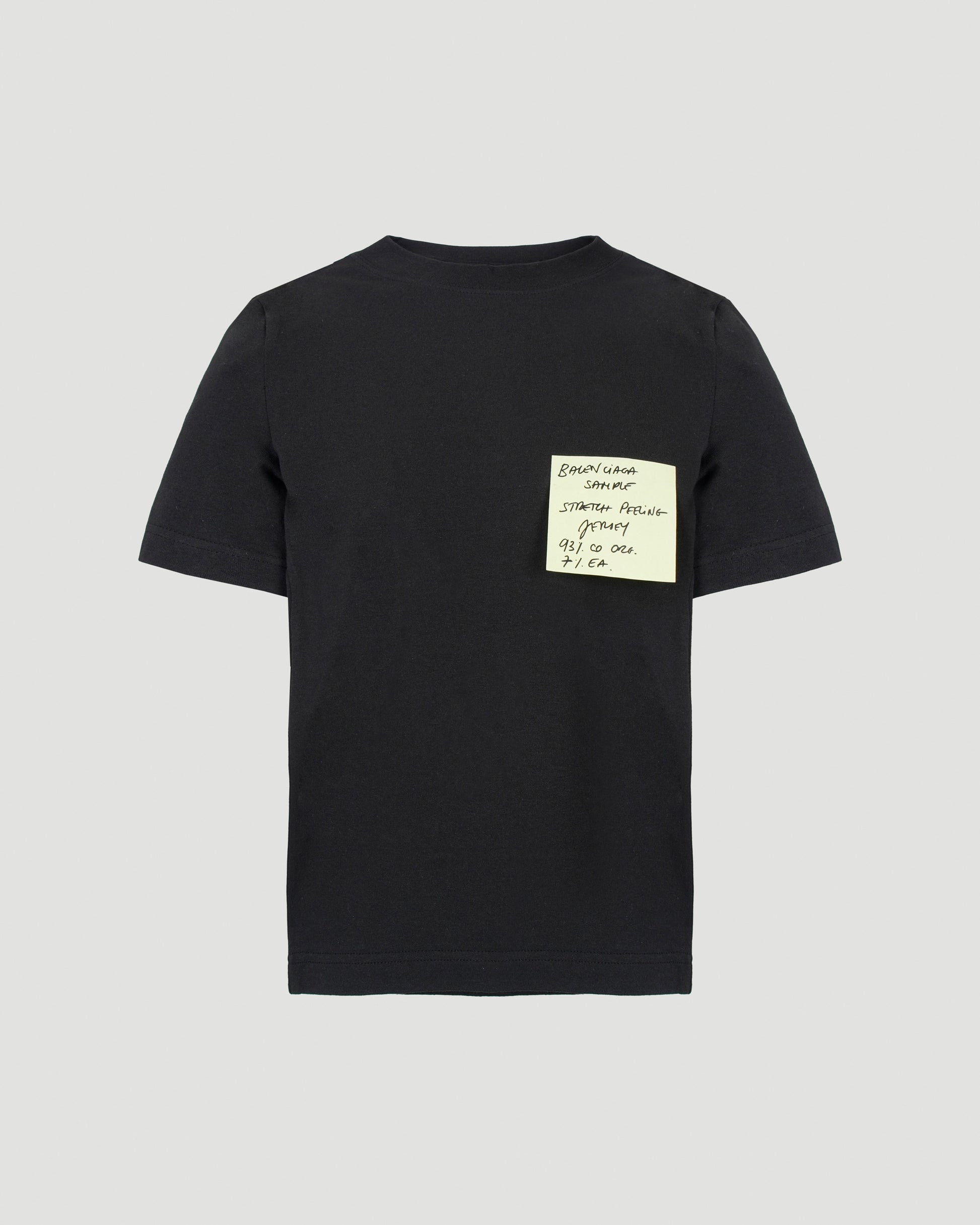 This T-shirt by Balenciaga is a definite conversation starter. Crafted from black stretch cotton with a slim fit, mock neck and short sleeves. Stands out with a hand-written paper note 'stuck' to the chest. Style with some jeans or leather trousers and some oversized sneakers for a cool look.