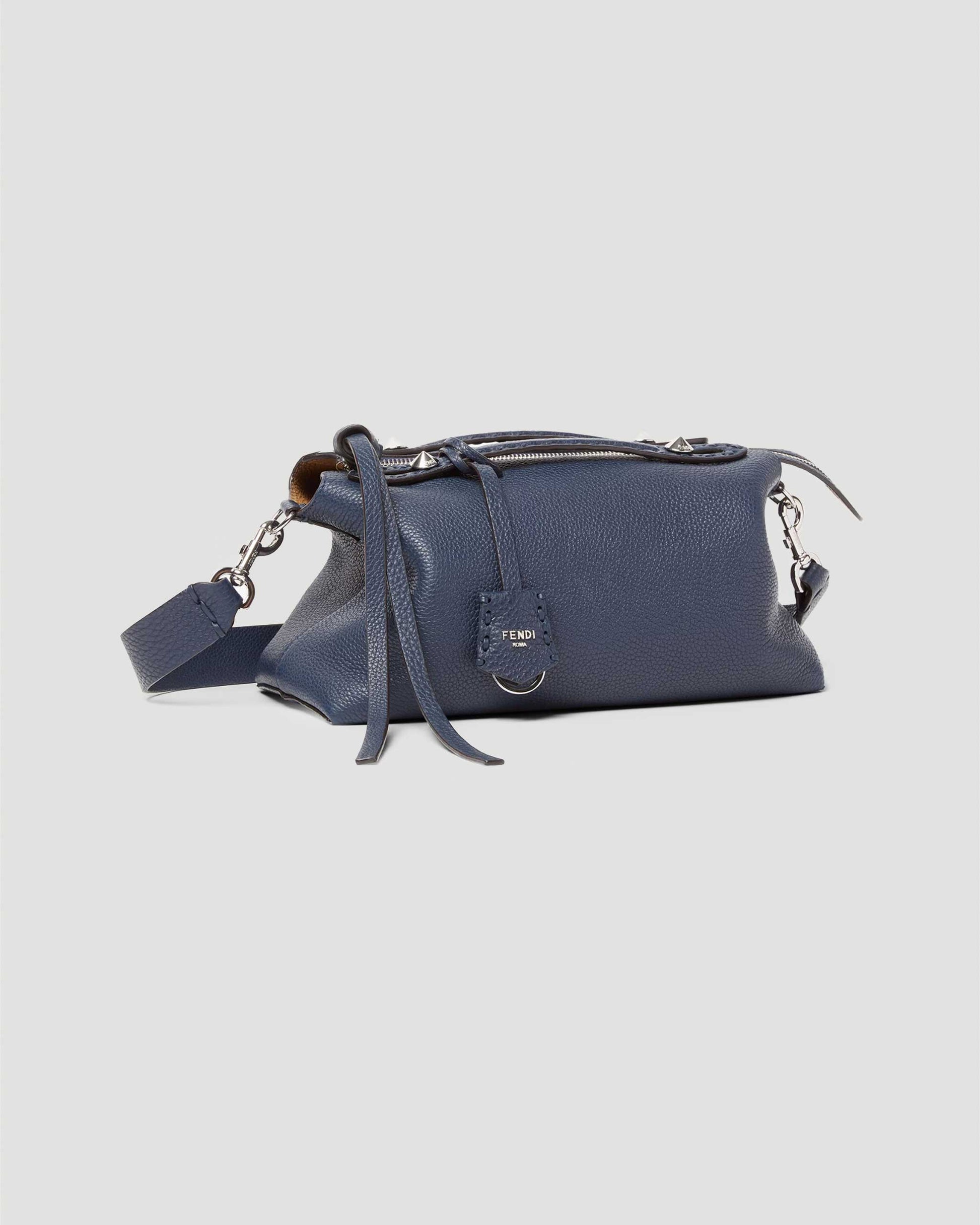 This iconic medium By The Way Selleria bag by Fendi is crafted from reversible Cuoio Romano leather in dark blue and beige calfskin with a natural grain and metal-free tanning process. Designed with 192 hand-sewn tone-on-tone macro topstitches, it features palladium-finish metalware, top handles, an adjustable detachable shoulder strap for hand, shoulder, or cross-body wear, a customizable hand-sewn Selleria charm, and a long knotted zipper-pull. Made in Italy.