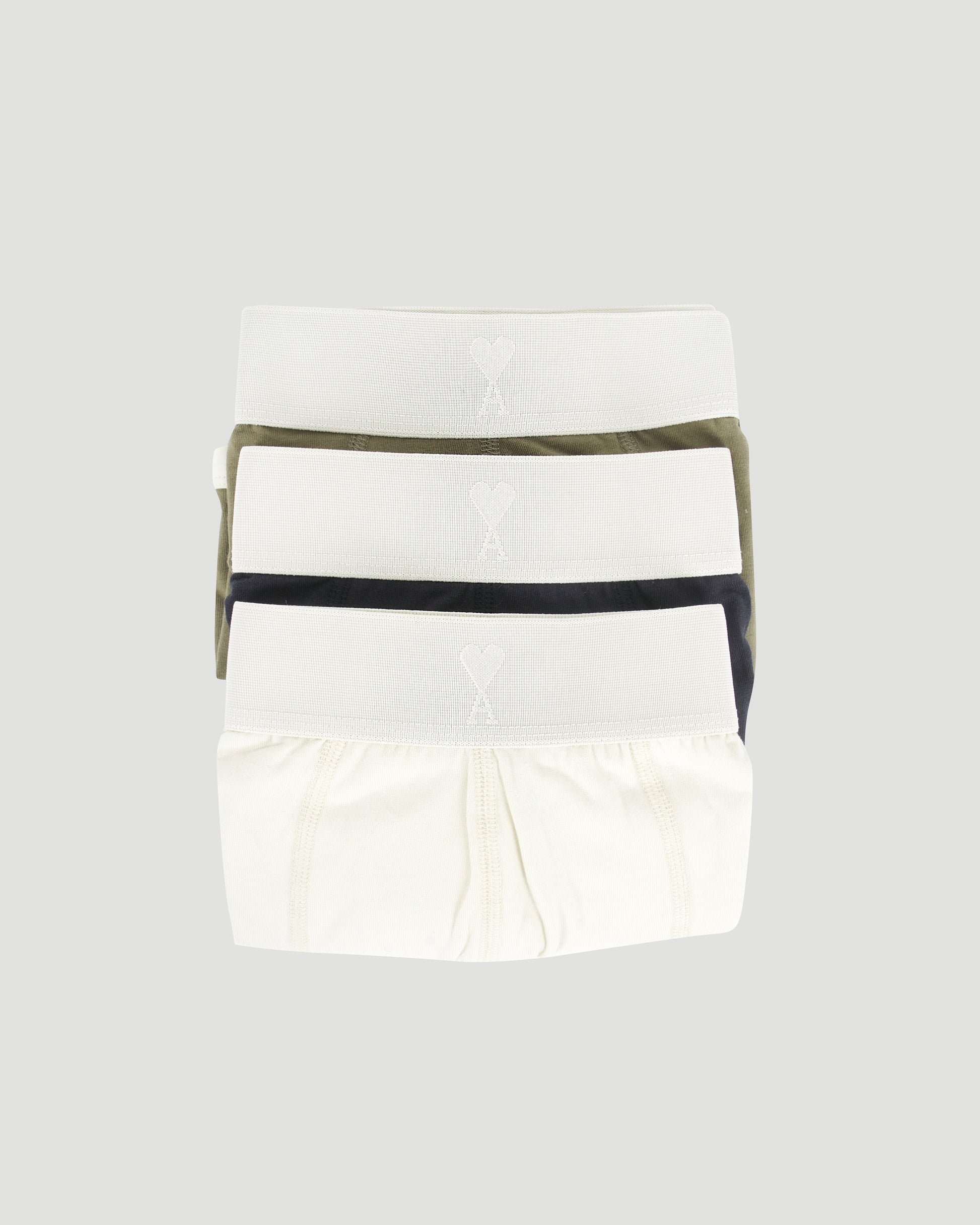 A pack of three boxers in cotton jersey by AMI, offered in anthracite, bronze, and ivory. Designed with an elastic waistband featuring the Ami de Cœur jacquard. A comfortable essential with signature branding.