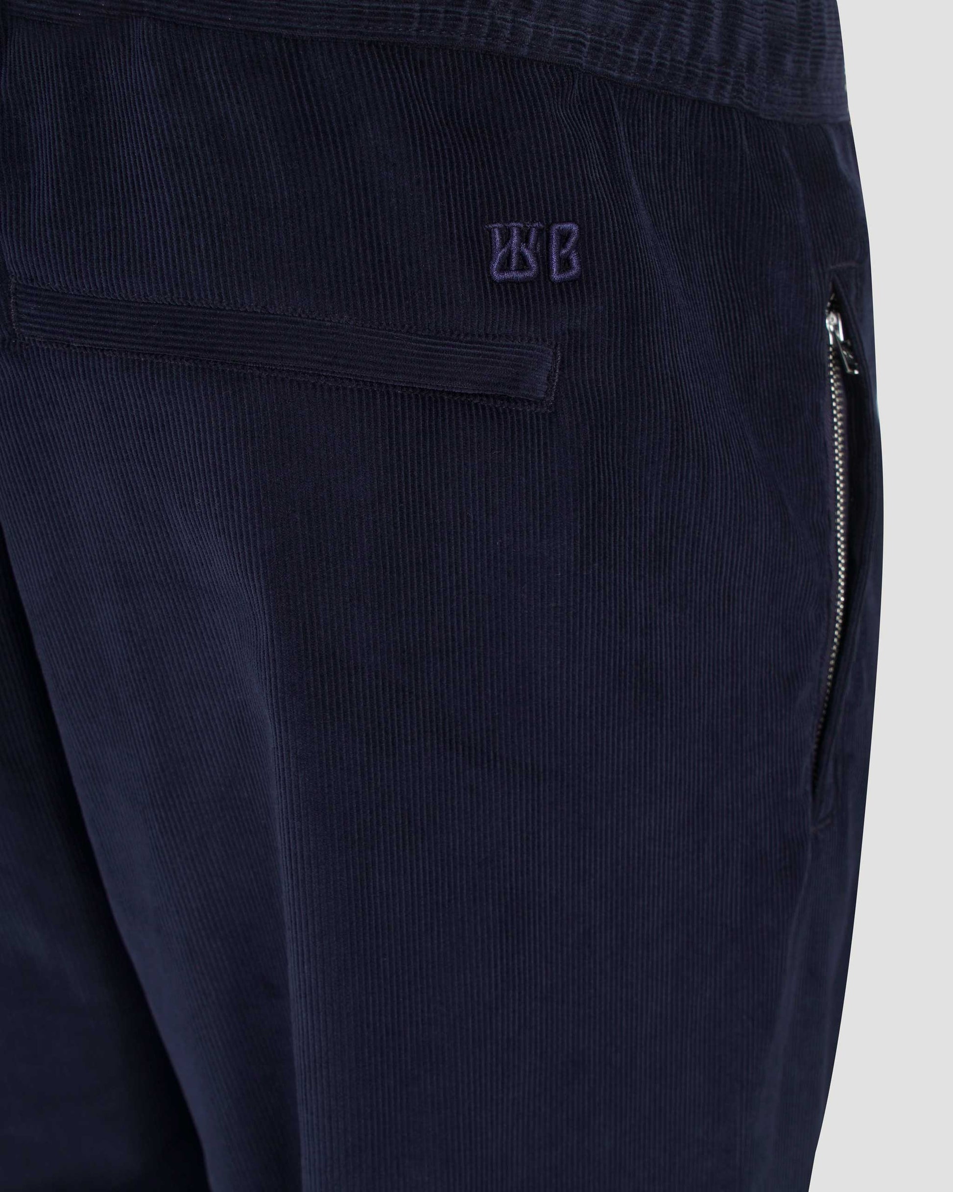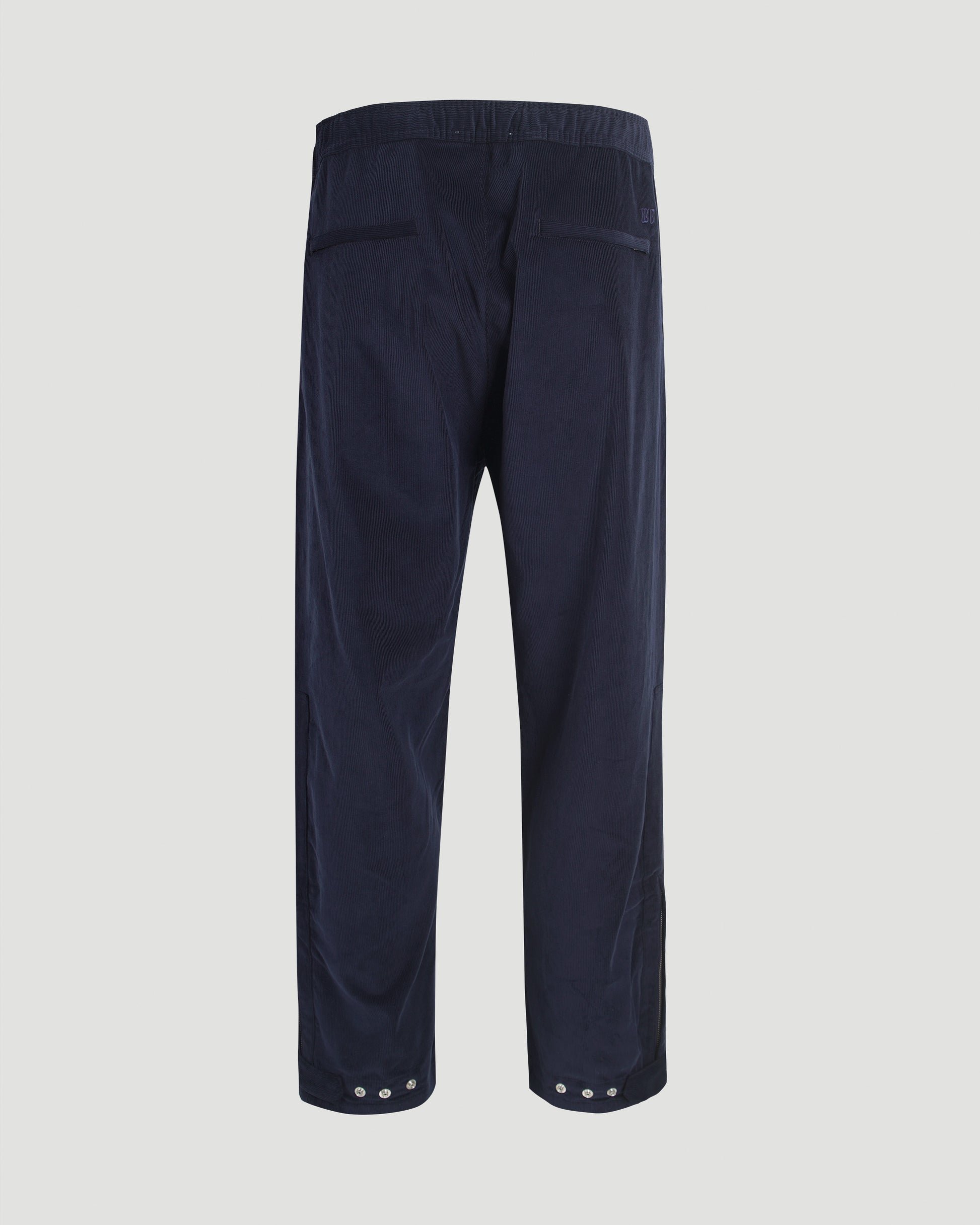 These navy pants by Wales Bonner feature an elasticated waistband, side zip pockets, and back pockets.