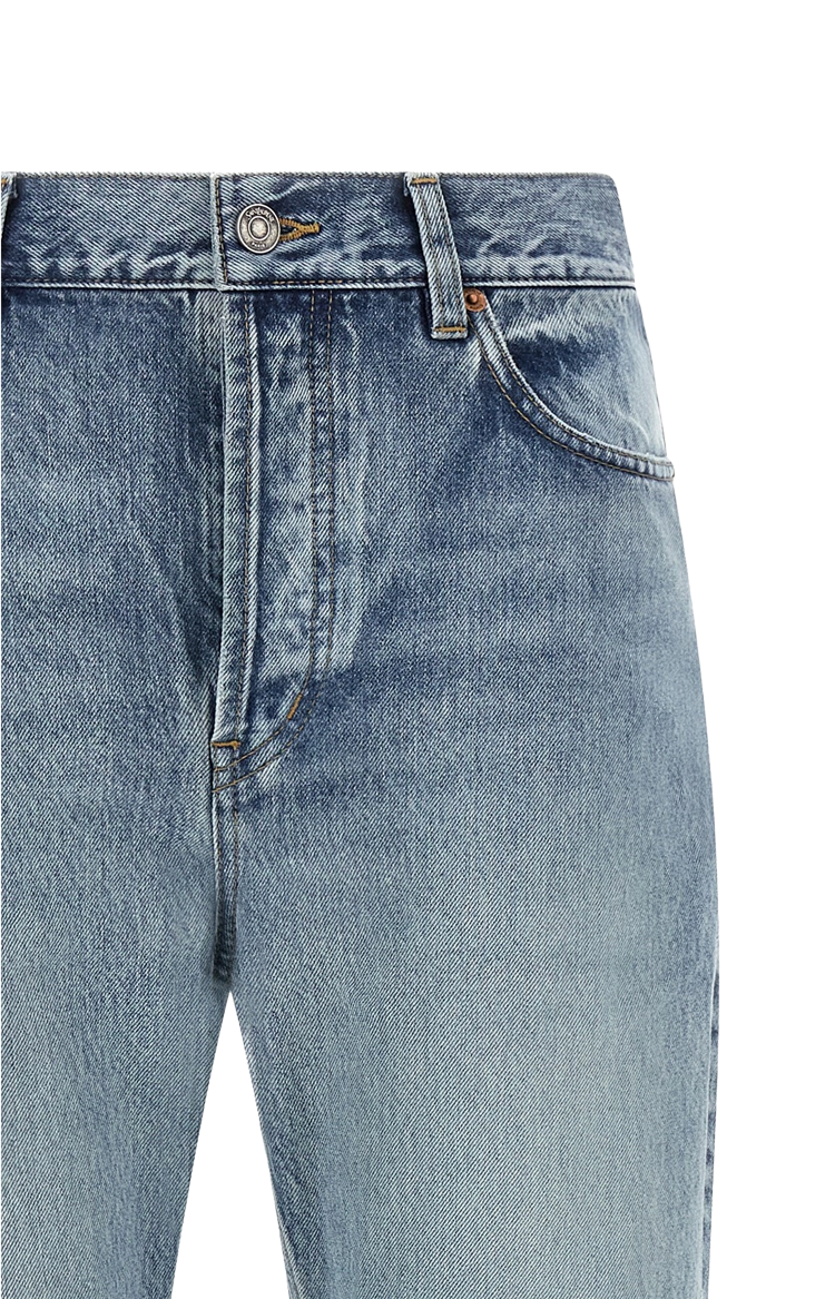 These jeans by Saint Laurent are crafted from 100% cotton. They feature a high-waisted slim-fit silhouette with a cropped leg, button fly, five-pocket construction, belt loops, and an embossed leather jacron.